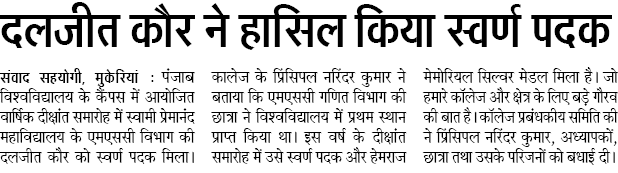 Uncategorized Gold Medal to Daljit Kaur By SPN College Mukerian on 2 May 2019 • ( Leave a comment ) Share this: Click to share on X (Opens in new window) X Click to share on Facebook (Opens in new window) Facebook Like Loading... Related Categories: Uncategorized