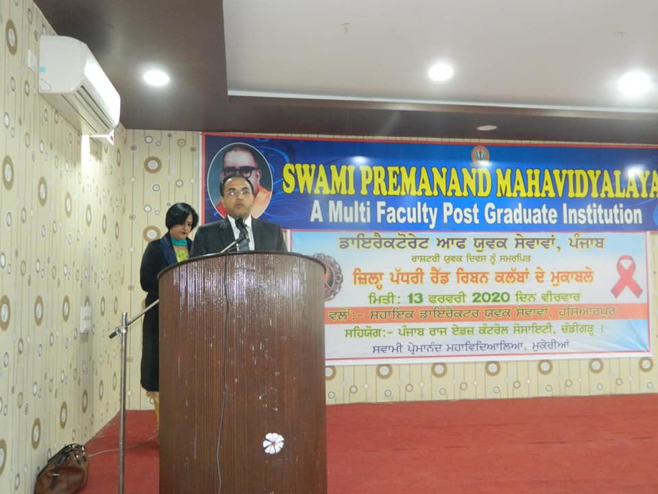 Blood Donation camp and Inter college Competitions were organized by the Youth and Red Ribbon clubs, NCC and NSS units of Swami Premanand Mahavidyalaya, Mukerian in collaboration with Directorate of Youth Services, Punjab and HDFC Bank. The event started with inauguration of the blood donation camp by chief guest Sh. Ajit Narang ji, Vice- President and Sh. Sanjeev Anand ji, Secretary, Management Committe, SPN College, Mukerian.Mr.Preet Kohli, Assistant Director, Youth Services, Hoshiarpur graced the event with his presence.The Blood Donation camp was very efficiently managed by Dr.J.P.Singh from Civil Hospital, Mukerian.There was great enthusiasm amongst the donors to donate blood for the noble cause. Further parallel to this were organized the Inter-college competitions.Rangoli and Poster making, Essay writing and the Declamation contest were the various events in which the students from 13 colleges of Hoshiarpur District participated. Dr.Sonia Sharma, convener of Youth and Red Ribbon club welcomed all the guests, faculty from different colleges and the participants for various events. Madam Indu Bala ji , MLA was the chief guest for this event.The honourable guests of this event were Sh.Ajit Narang ji, Sh.Sanjeev Anand ji and S.Preet Kohli ji. This event was inaugurated by the lamp lighting ceremony by the esteemed guests. Principal Dr. Sameer Sharma ji welcomed the guests and addressed the audience. He threw light on the indespensible role a youth has in taking the nation onto the road of success. He also guided the students about the teachings and preachings of Swami Vivekananda, whose birthday is marked as National Youth Day by the Government of India.Sh.Ajit Narang ji also addressed the audience and expressed his valuable views to the youth for their as well as the well being of the society. S. Preet Kohli ji also addressed the audience and gave his valuable remarks. He very efficiently brought to the knowledge of the audience about the various efforts done by the Government of Punjab for upliftment of the youth. He convinced the faculty members and the youth to come forward and participate in such events as Government is providing various sources for the youth welfare. Madam Indu Bala ji also guided the students , gave them valuable suggestions to respect their elders, to work for their culture, to participate in events and to never loose hope and work hard to their level best. Some cultural items of Bhand, Mimicry, Play and Bhangra were performed by the students of SPN college to welcome all the guests.76 units of blood were donated during the blood donation camp.The winners of the inter- college competition, participants of these events and the blood donors were all honoured with certificates and trophies.Dr.Pushpinder Kumari, Prof. Sunil Agarwal, Dr.Sameer, Prof.Harpreet Kaur, Prof.Nidhi Sood, Prof.Pankaj Sareen, Dr.Gurpreet Kaur, Prof.Gopi Sharma, Prof.Bikramjit Singh, Prof.Amandeep Singh were all present at the event.