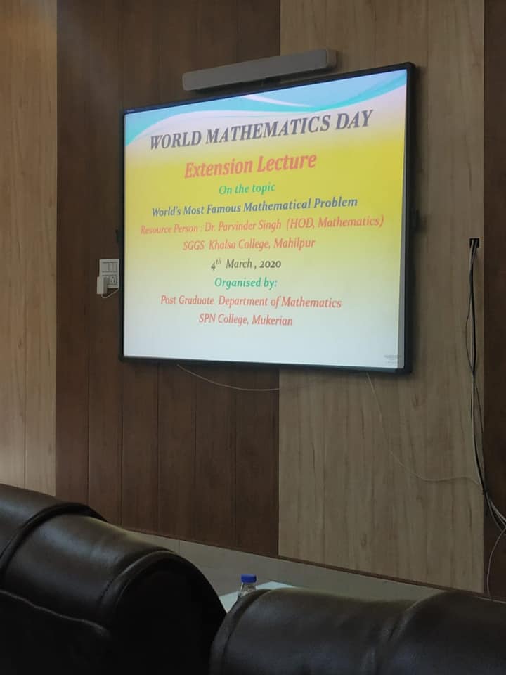To celebrate the World Mathematics Day , the Department of Mathematics organised an extension lecture on the topic “World’s Most Notorious Mathematical Problems”. The lecture was delivered by Dr. Parvinder Singh, Head, Deptt. Of Mathematics, S.G.G.S Khalsa College, Mahilpur. Principal Dr. Sameer Sharma also graced the occasion. The event commenced with the welcome address by the Head of the Mathematics Department, Prof. P.K Singla.
