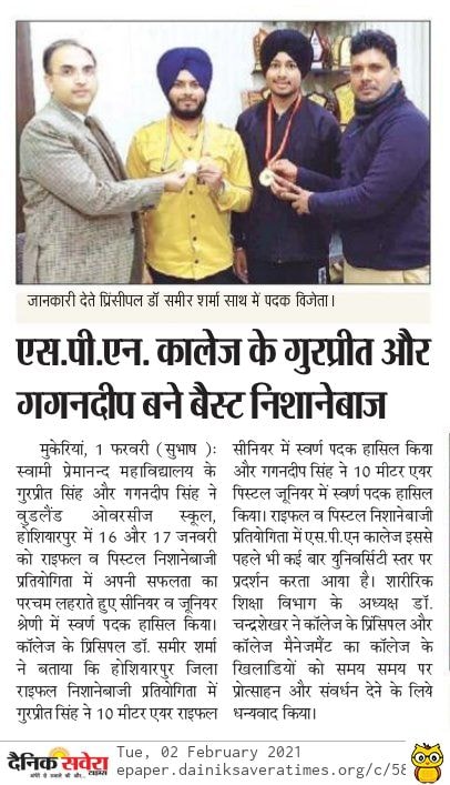 Students of Swami Premanand Mahavidyalaya, Mukerian won gold medals in both senior and junior rifle and pistol shooting competition at district level held in Woodland Overseas School Hoshiarpur on 16 and 17 January 2021.