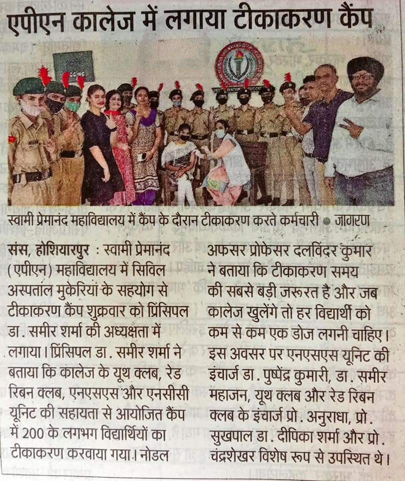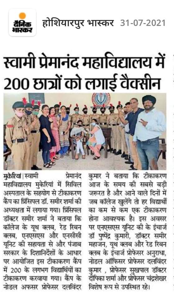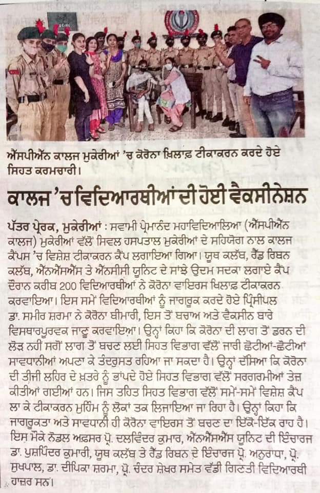 Under the patronage of Principal Dr.Sameer Sharma, Youth Club, Red Ribbon Club, N.S.S and N.C.C units of Swami Premanand Mahavidyalaya, Mukerian, in collaboration with Civil Hospital Mukerian , organized a Covid Vaccination Drill at the premises of the college. The team of the doctors from Civil Hospital Mukerian visited the campus for this vaccination drive.