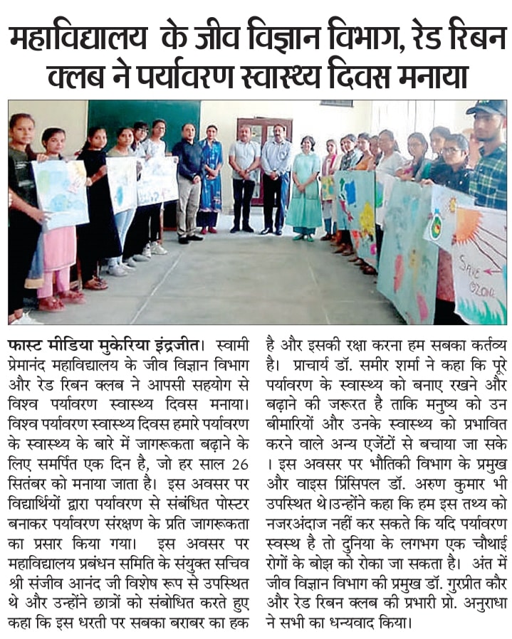 स्वामी प्रेमानंद महाविद्यालय के जीव विज्ञान विभाग और रेड रिबन क्लब ने आपसी सहयोग से विश्व पर्यावरण स्वास्थ्य दिवस मनाया। विश्व पर्यावरण स्वास्थ्य दिवस हमारे पर्यावरण के स्वास्थ्य के बारे में जागरूकता बढ़ाने के लिए समर्पित एक दिन है, जो हर साल 26 सितंबर को मनाया जाता है। इस अवसर पर विद्यार्थियों द्वारा पर्यावरण से संबंधित पोस्टर बनाकर पर्यावरण संरक्षण के प्रति जागरूकता का प्रसार किया गया। इस अवसर पर महाविद्यालय प्रबंधन समिति के संयुक्त सचिव श्री संजीव आनंद जी विशेष रूप से उपस्थित थे और उन्होंने छात्रों को संबोधित करते हुए कहा कि इस धरती पर सबका बराबर का हक है और इसकी रक्षा करना हम सबका कर्तव्य है। प्राचार्य डॉ. समीर शर्मा ने कहा कि पूरे पर्यावरण के स्वास्थ्य को बनाए रखने और बढ़ाने की जरूरत है ताकि मनुष्य को उन बीमारियों और उनके स्वास्थ्य को प्रभावित करने वाले अन्य एजेंटों से बचाया जा सके । इस अवसर पर भौतिकी विभाग के प्रमुख और वाइस प्रिंसिपल डॉ. अरुण कुमार भी उपस्थित थे।उन्होंने कहा कि हम इस तथ्य को नजरअंदाज नहीं कर सकते कि यदि पर्यावरण स्वस्थ है तो दुनिया के लगभग एक चौथाई रोगों के बोझ को रोका जा सकता है। अंत में जीव विज्ञान विभाग की प्रमुख डॉ. गुरप्रीत कौर और रेड रिबन क्लब की प्रभारी प्रो. अनुराधा ने सभी का धन्यवाद किया
