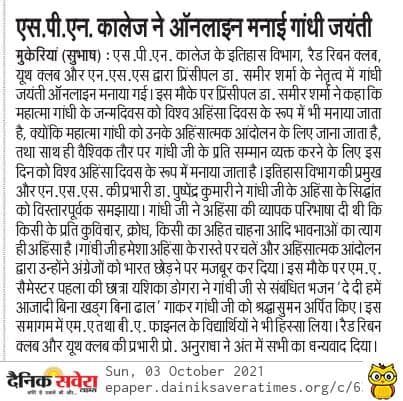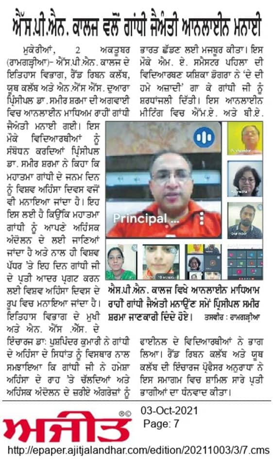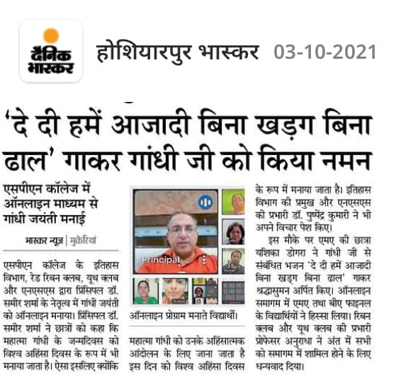 The Post-Graduate Department of History, in collaboration with Red Ribbon Club and Youth Club of Swami Premanand Mahavidyalaya, Mukerian , celebrated Gandhi Jayanti through an online event. Addressing the students, Principal Dr. Sameer Sharma gave a brief on the various facets of Gandhiji’s life. He also mentioned about Gandhiji’s struggle for freedom and the sacrifices made by him for the country.