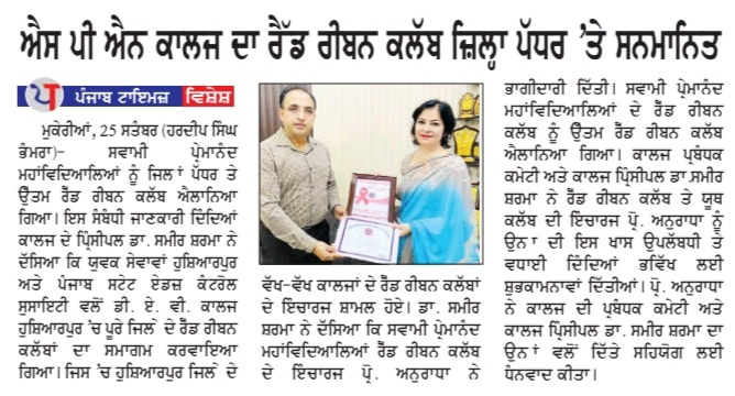 Apprising about the event, Principal Dr. Sameer stated that the event was organized to appreciate five Red Ribbon Cubs from the district for their praiseworthy and efficacious work during Covid-19 pandemic. He further said various colleges from Hoshiarpur participated in this event, where the Red Ribbon Club of our college was declared the best red ribbon club of the district along with other four clubs. He also congratulated Ms. Anuradha (Incharge Youth and Red Ribbon Club) for her strenuous efforts to make the college proud. Ms. Anuradha thanked the college principal and the college managing committee for their support and motivation.