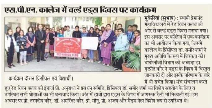 On the occasion of World AIDS Day, the department of Biology and Red Ribbon Club, Swami Premanand Mahavidyalaya, Mukerian organised an event to raise awareness about AIDS on 01 December 2021. The theme for this year’s World AIDS Day was “End Inequalities, End AIDS”. The event was inaugurated with a rally in which students tried to spread awareness by using slogans “Let’s Join Our Hands Together, Take a Pledge for an AIDS Free World”.