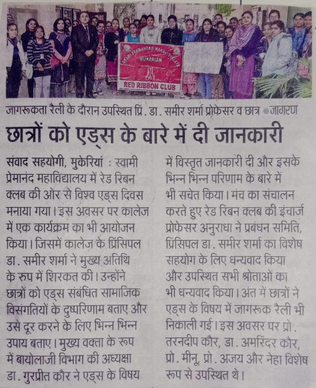 Prof. Anuradha , Incharge Red Ribbon Club also shared her views on the dangers of HIV/AIDS and its negative impact on health. The program concluded with a pledge to the AIDS free world taken by all the students. Dr. Amrinder Kaur, Prof. Tarandeep Kaur, Prof. Meenu, Prof. Ajay and Ms. Neha were also present.