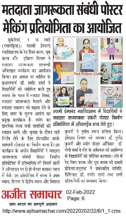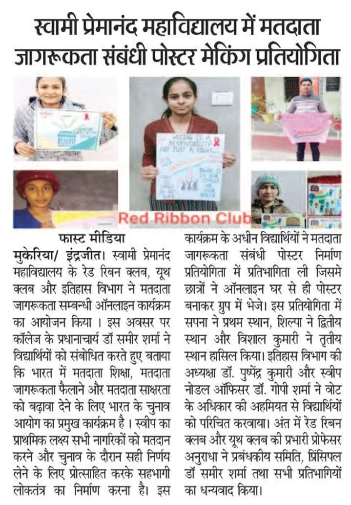 The Red Ribbon Club in collaboration with the Youth Club and History department of Swami Premanand Mahavidyalaya, Mukerian organised an online poster making competition to create awareness about the right to vote among the youngsters. Principal Dr. Sameer Sharma said that the objective of the competition was not only to augment awareness about encouraging people to cast their vote in the upcoming assembly elections but also the importance of vote casting in democracy. He urged students to vote and cast their vote righteously. Further, an online poster making competition was organised where Sapna stood first, Shilpa second and Vishal Kumari obtained third position. Dr. Pushpinder Kumari and Dr. Gopi Sharma apprised students about the importance of voting in democratic countries. Ms. Anuradha, Incharge Red Ribbon and Youth Club, expressed heartfelt gratitude to the college principal and the college managing committee for motivating students. She applauded the efforts and zest of participants.