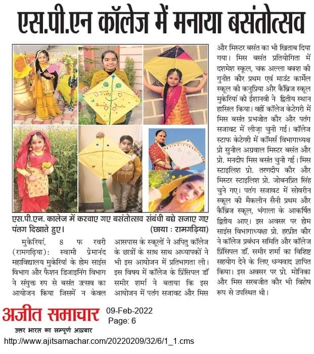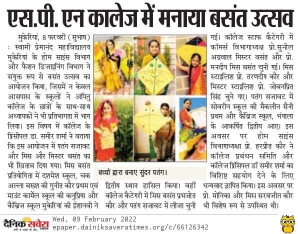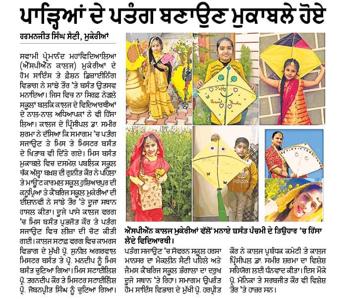 On the auspicious occasion of Basant Panchami, the departments of Home Science and Fashion Designing, Swami Premanand Mahavidyalaya, Mukerian celebrated the festival fervently by organizing Ms & Mr. Basant and Ms. & Mr. Stylish contests on February 07, 2022. The said contest was organised both for teachers and students. Principal Dr. Sameer Sharma graced the occasion with his presence as the chief guest. In his address, he highlighted the significance of this day and the importance of Indian culture.The activities were supervised by Asst. Prof. Harpreet Kaur, Head, department of Home Science. She stated that students from different schools and colleges participated in the contest. They showcased the vibrant tradition of Punjab with fervour and zeal. On this occasion, Guneet Kaur from Dashmesh School won Ms. Basant. Prabhjot Kaur from SPN College bagged first position in kite making. Asst. Prof. Mandeep Kaur won Ms. Basant and Assoc. Prof. Sunil Aggarwal bagged the title of Mr. Basant. Whereas Tarandeep Kaur and Asst. Prof. Jabanpreet Singh won the titles of Ms. and Mr. Stylish.