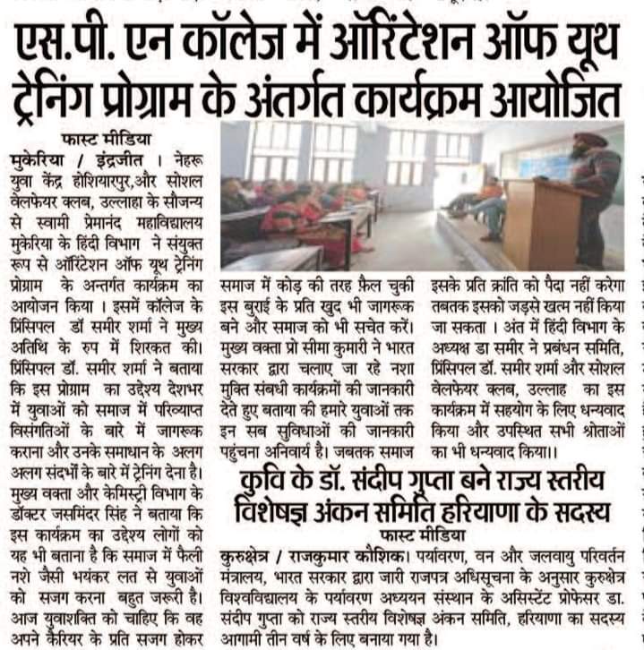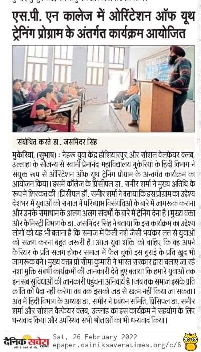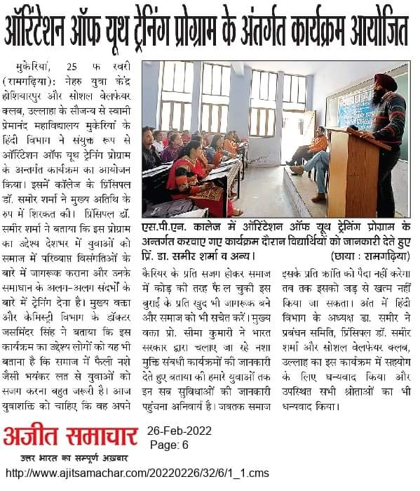 SPN College Mukerian in collaboration with Nehru Yuva Kendra Hoshiarpur and Social Welfare Club Ulaha organised Youth Training Programme. Principal Dr.Sameer Sharma was the chief guest of the event.While interacting with the students Principal Dr.Sameer Sharma stated that the main objective behind organising these types of events is to create awareness among youth about the contemporary issues of the society and trained them to cope – up with the same. Dr.Jasminder Singh , Department of Chemistry, also shared his views on prevalent culture of drugs in today’s youth and described how to create awareness in society about the drastic effects of drugs.On this occasion Asst.Prof.Seema( Hindi department)threw light on various schemes of government regarding the Drugs de- addiction centres, Rehabilitation centres etc.and stated that it’s a need of the hour that today’s youth should be aware of these schemes of government if, we want to nip the evil of drugs in bud. At the end Dr Sameer (HOD Hindi department) thanked worthy Management, Principal Dr.Sameer Sharma and Social Welfare Club Ulaha for their co-operation and making the event successful.