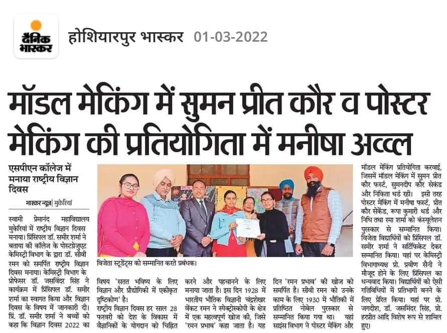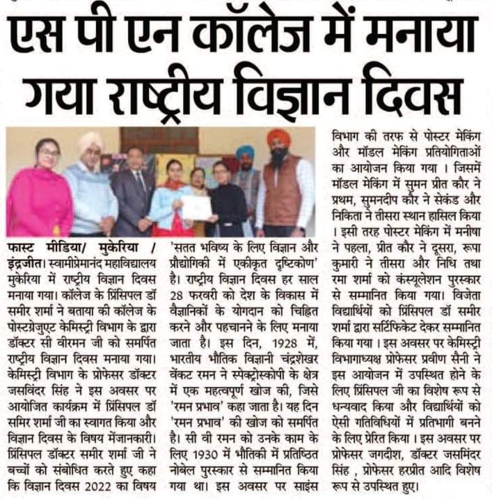 To commemorate the Great Visionary Dr. CV Raman, the post graduate department of Chemistry, Swami Premanand Mahavidyalaya, Mukerian celebrated “National Science Day” on February 28, 2022. The theme of this year’s Science Day was ‘Integrated Approach in Science and Technology for a Sustainable Future’. Dr. Jasminder Singh commenced the event with a warm welcome of the college principal and all participants. Gracing the occasion as Chief Guest, Principal Dr. Sameer Sharma highlighted the importance of science and technology in society. Recalling the legendary CV Raman, he presented a brief on the Raman Effect.