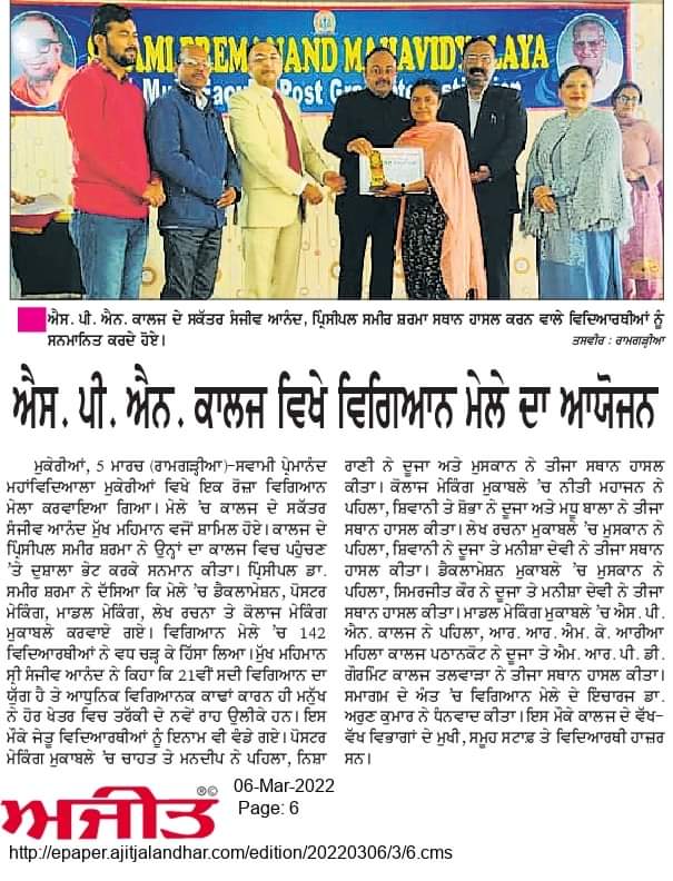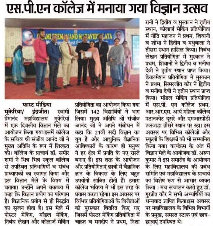 One day Science Festival organised at SPN College Mukerian by the Faculty of Sciences. Secretary of College Management Committee Sh Sanjeev Anand was the chief guest of the fest.College Principal Dr Sameer Sharma welcomed the chief guest and all the participants from various schools and colleges and highlighted about the objectives of organising such festivals.
