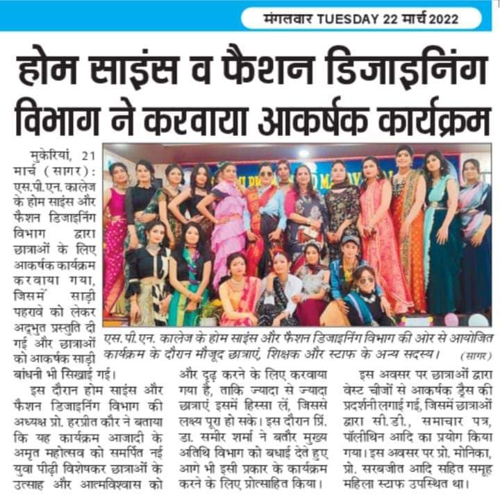 Fashion Designing Department of SPN College Mukerian organised a Fashion Show on different styles of Saree Draping. Describing about the event Prof.Harpreet Kaur(HOD,Home-Science and Fashion Designing Department) stated that the main purpose behind organising this event is, to inculcate self- confidence in today’s youth and to develop a habit of creativity in them, by preparing dress material from the waste like C.D, newspaper, magazine,etc. College Principal Dr.Sameer Sharma was the chief guest of the day. While interacting with the students,he appreciated the creativity and confidence of the students and he further encouraged the department and students to organise such events in the future also.On this occasion Prof.Monika, Prof.Sarabjit and other staff members were also present