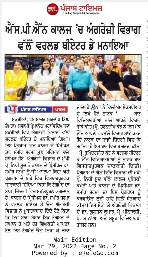 The Post-graduate Department of English in collaboration with English Literary Society commemorated World Theatre Day on March 28, 2022. Asst. Prof. Nidhi Sood, Head, department of English commenced the event with a warm welcome of the college principal, Dr. Sameer Sharma. Sharing her views on the history of theatre, she stated that for centuries, theatre and drama have been the most popular art form and each age had its own mode of expression and theatrics in place. While addressing the students, principal Dr. Sameer Sharma highlighted the history of the theatre and importance of theatre in the field of entertainment and in one’s life. Asst. Prof. Tarandeep Kaur talked about the indispensability of theatre in every aspect of life. She also appreciated the crucial role media and technology have played in putting forward the different nuances of theatrical production through the process of infotainment. On this occasion, a movie “Waiting for Godot” was shown to the students. The event was followed by a discussion during which some insightful questions were put forward by students. Altogether it was a scintillating event that lifted everyone’s spirit to a high level. The event ended with a formal vote of thanks proposed by Asst. Prof. Rupinderjeet Kaur. Dr. Gulshan Kumar, Ms. Minakshi and Ms. Taniya were also present at the event.