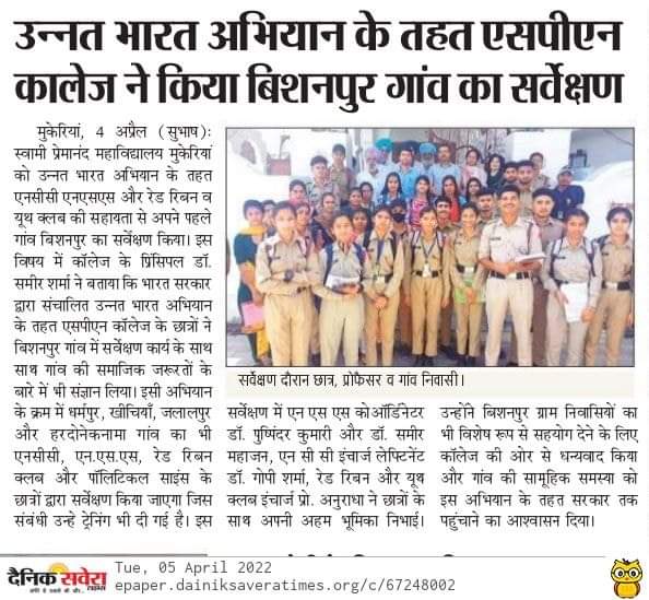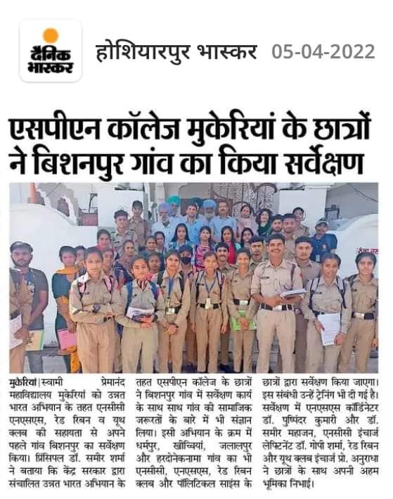 The college has organised a one day survey at Bhishanpur village of Mukerian on 4 March 2022. The team comprising the department of Political Science, NSS, NCC, Red Ribbon, Youth Club and students visited the village to understand the socio-economic profile and problems of the villagers. The survey emphasised the issues pertaining to sanitation, drinking water supply, energy, agriculture and allied activities, irrigation, education, health, etc. Moreover, it sensitised students towards the rural environment and requirements. The survey was conducted through wide consultation with Dr. Pushpinder Kumari and Dr Sameer Mahajan (Coordinators NSS), Lieutenant Dr. Gopi Sharma (Incharge NCC), and Asst. Prof. Anuradha (Incharge Red Ribbon and Youth Club).