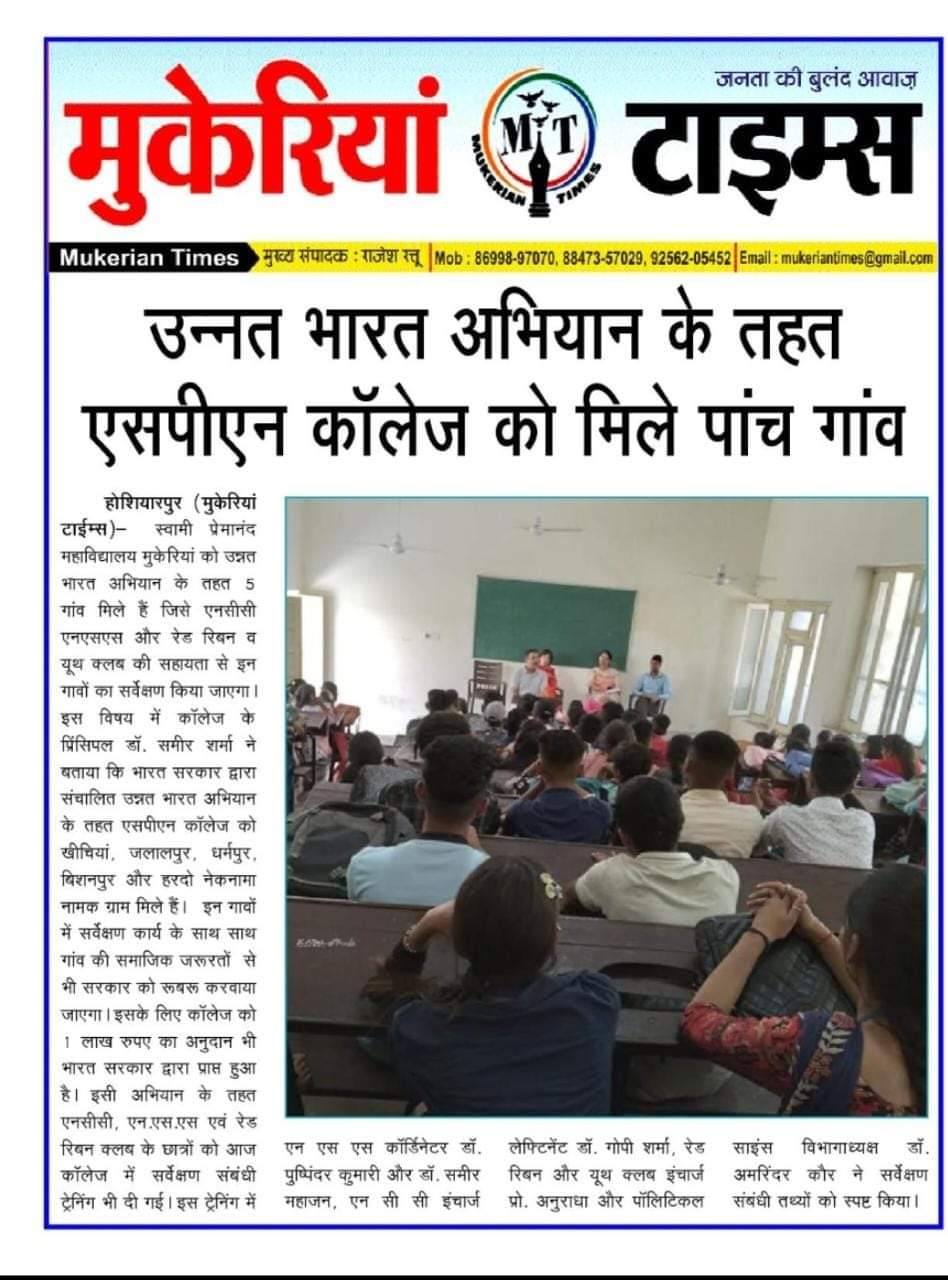 Keeping in tune with its ethos of service, Swami Premanand Mahavidyalaya, Mukerian has taken the initiative to adopt five villages under the scheme of ‘Unnat Bharat Abhiyan’. The college has adopted Dharampur, Khicchian, Jalalpur and Hardo Neknama villages. The objective of this scheme is to enable higher educational institutions to work with the people of rural India in identifying development challenges and evolving appropriate solutions for accelerating sustainable growth.