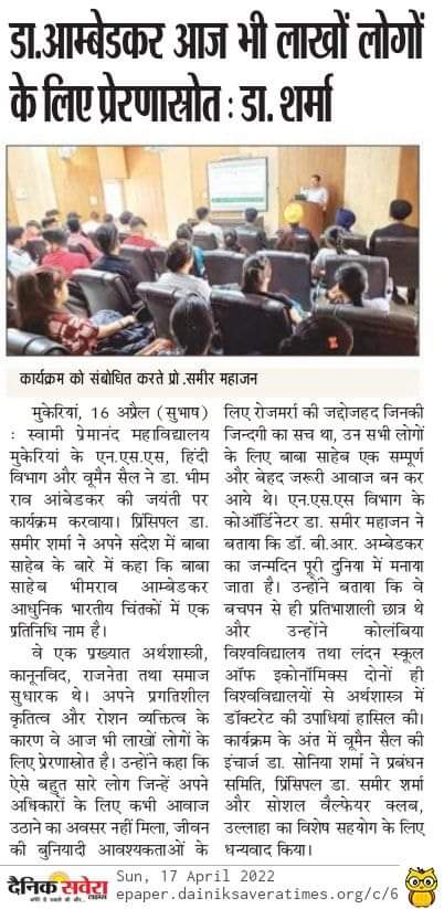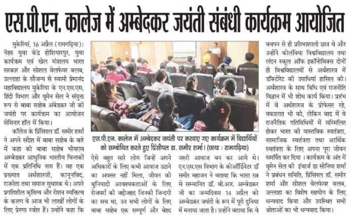 Swami Premanand Mahavidyalaya, Mukerian celebrated the birth anniversary of Dr. Ambedkar who was a key architect of the Indian Constitution. A special one-day event was jointly organised by NSS, the department of Hindi, Women Cell and Nehru Yuva Kendra Hoshiarpur to commemorate Babasaheb’s teachings and works. Recalling the icon of our nation, Principal Dr. Sameer Sharma stated that Dr. BR Ambedkar dedicated his life to working for the upliftment of untouchables, women, and labourers. He further added that Dr. Ambedkar envisioned a society where the weaker sections, marginalised and downtrodden get equal rights and respect. Dr. Sameer Mahajan, Coordinator NSS, shared his views on Dr. Ambedkar’s life and teachings. The session ended with a note of thanks offered by Dr. Sonia Sharma.