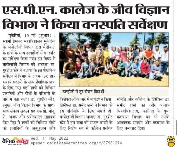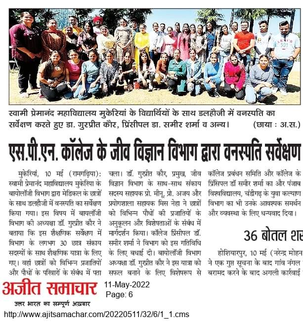 The Department of Biology of Swami Premanand Mahavidyalaya, Mukerian organized a trip to Dalhousie for the Botanical Survey. About 30 students of the department accompanied the faculty members for the trip. The students got to know about various species and families of plants. Dr. Gurpreet Kaur, Head, Department of Biology alongwith the faculty members Asst. Prof. Meenu, Asst. Prof. Ajay and the laboratory assistant Neha guided the students about adaptations and characteristics of various plant families. Dr. Gurpreet Kaur thanked the authorities of the college, Principal, Dr. Sameer Sharma and Youth welfare department of Panjab University, Chandigarh to make this trip a successful one by their required support and arrangements.