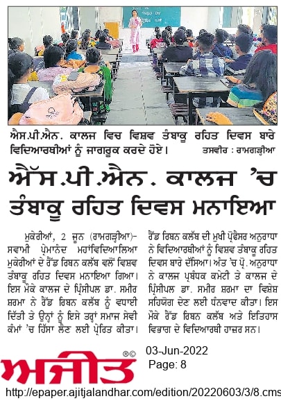 World No Tobacco Day was celebrated by the Red Ribbon Club of Swami Premanand Mahavidyalaya Mukeria. On this occasion, the Principal of the college, Dr. Sameer Sharma congratulated the Red Ribbon Club and encouraged them to participate in social work in a similar manner. Asst. Professor Anuradha, President of the Red Ribbon Club told the students about World No Tobacco Day. She said that tobacco is hollowing out the youth from inside. We should know about the harmful and terrible diseases caused by tobacco and should also make society aware. In the end, Ms. Anuradha thanked the College Management Committee and the Principal of the college Dr. Sameer Sharma for their special cooperation. Students of the Red Ribbon Club and the History Department were present on this occasion.