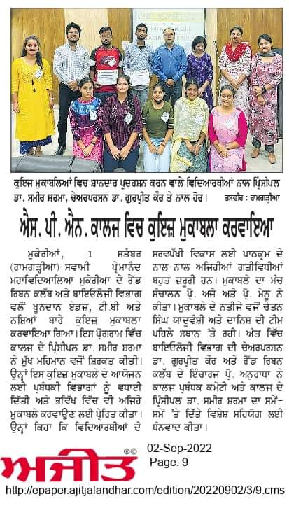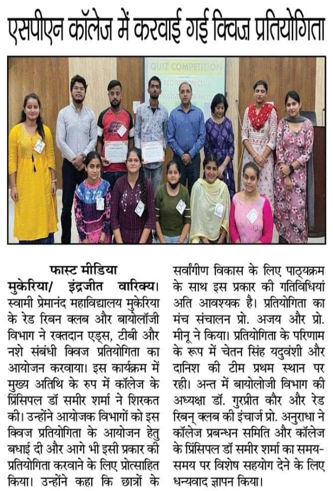 Red-Ribbon Club of Swami Premanand Mahavidyalaya, Mukerian in collaboration with Biology Department organised a Quiz Competition on the topic Blood Donation T.B,AIDS and Drugs.Principal Dr.Sameer Sharma graced the occasion as chief guest.He appreciated the efforts of Prof.Anuradha(Incharge,Red-Ribbon Club) and Dr.Gurpreet Kaur,HoD, Biology Department and encouraged them to organise such events in the future also.While interacting with the students Principal Dr.Sameer Sharma stated that these types of events play a vital role in the all round development of students.Stage was beautifully conducted by Prof. Ajay and Prof. Meenu.In the competition,the team lead by Chetan Singh Yaduvanshi and Danish bagged the first prize.In the end Dr.Gurpreet Kaur and Prof.Anuradha thanked the worthy Management and Principal Dr Sameer Sharma for their cordial support and guidance.
