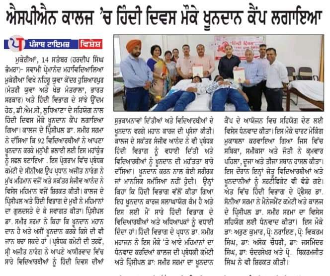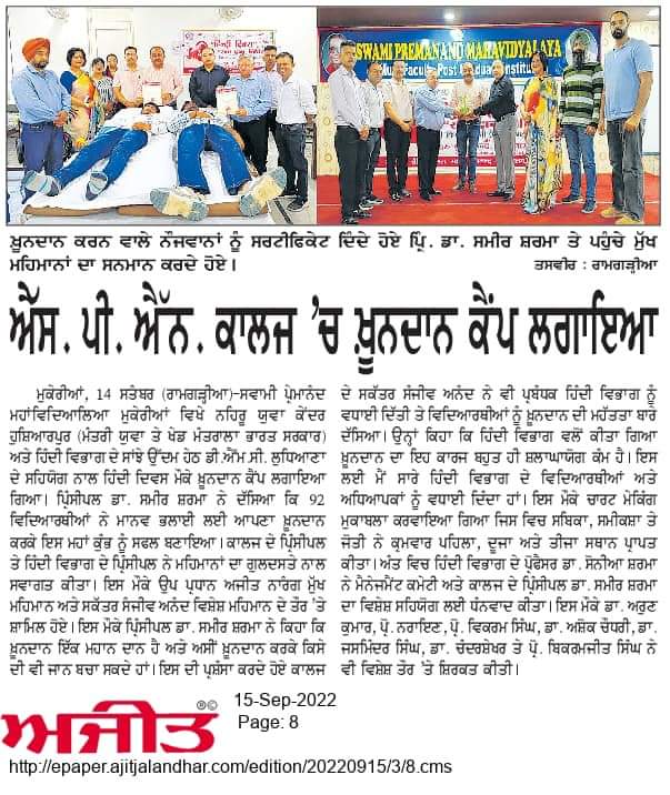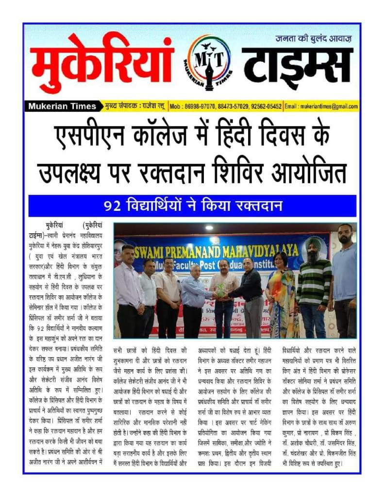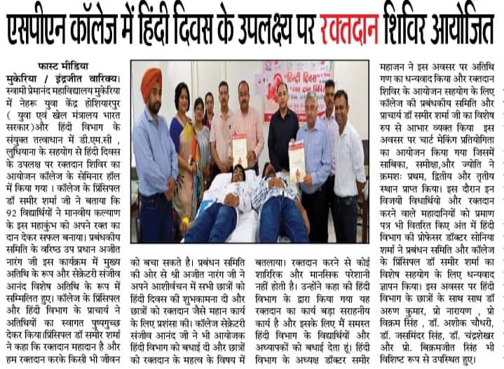 A blood donation camp was organised by Swami Premanand Mahavidyalaya, Mukerian in association with the Department of Hindi, DMC Ludhiana and Nehru Yuva Kendra, Hoshiarpur. The camp witnessed active participation from students and employees who volunteered to donate blood for the noble cause. The camp was inaugurated by the chief guests, Vice-president Sh. Ajit Narang and Secretary, College Managing Committee Sh. Sanjeev Anand. They were welcomed by Principal Dr. Sameer Sharma and other staff members. Speaking on the occasion, Principal Dr. Sameer Sharma said that it gives us immense contentment to be able to contribute towards our community by way of donating blood for the needy patients. Nearly 90 volunteers from the college donated their blood for this noble cause. Vice-President Sh. Ajit Narang said that the aim of this camp was to inculcate social responsibility among students. Mr. Sanjeev Anand commended the volunteers. Dr. Sameer Mahajan, Head, department of Hindi enlightened students about the importance of donating blood. On this occasion, a poster making competition was also organised where the top three positions were bagged by Sabika, Samiksha and Jyoti. The event concluded with a formal vote of thanks by Dr. Sonia Sharma. The donors were awarded with certificates as a mark of appreciation. Dr. Arun Kumar, Prof. Narayan, Prof. Vikram, Prof. Ashok Chaudhary, Prof. Jasminder, Prof. Chandrashekhar, Prof. Bikramjit were also present at the event.