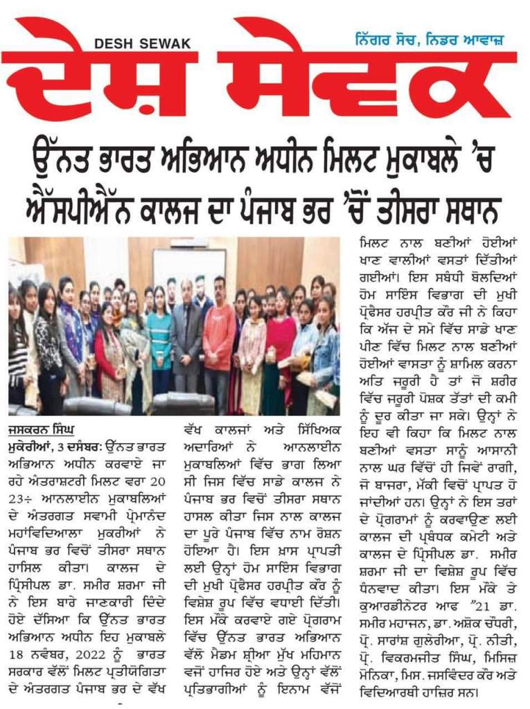 Swami Premanand Mahavidyalaya, Mukerian bagged third position in an online competition on “International Year of Millets 2023”. The aim of this competition was to create awareness about the health benefits of millet. Principal Dr. Sameer Sharma said that various colleges and academic institutions from Punjab took part in this competition, where our students grabbed the third position in the state. He also lauded Asst. Prof. Harpreet Kaur, Head, Department of Home Science for her incessant efforts behind this great accomplishment. Ms. Shiya graced the event as a chief guest. She felicitated the winners with different delicacies made from millets. Apprising about the event, Asst. Prof. Harpreet Kaur said the objective of this competition was to disseminate information about the qualities of millets and their health benefits. She further thanked the college managing committee and the college principal for their support and motivation. Dr. Sameer Mahajan (Coordinator), Dr. Ashok Chaudhary, Ms. Saransh, Ms. Niti, Mr. Bikramjit, Ms. Monika and Ms. Jaswinder Kaur were also present.