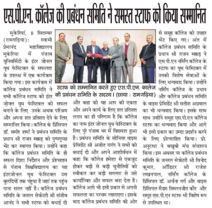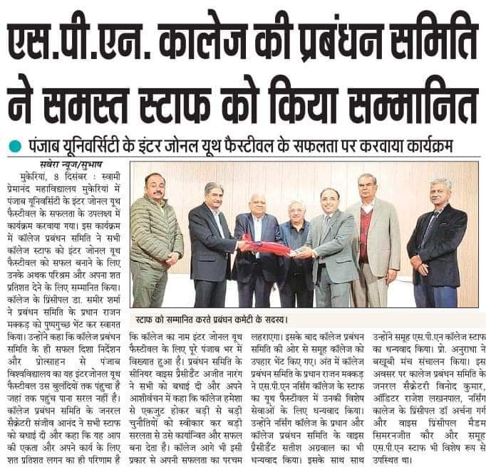 A felicitation ceremony was organized at Swami Premanand Mahavidyalaya, Mukerian to mark the grand success of Panjab University, Chandigarh 63rd Inter Zonal Youth and Heritage Festival, held in the college premises from 10th November,22 to 13th November,22. The College Managing Committee honoured Principal Dr. Sameer Sharma and the college staff for their tireless hard work and strenuous endeavors for making the Inter Zonal Youth and Heritage Festival a huge success. Principal Dr. Sameer Sharma accorded a floral welcome to the President of the Managing Committee Sh. Rajan Makkar Ji and expressed his heartfelt gratitude for the motivation, guidance and unconditional support of all the members of the Managing Committee without which this event would not have reached the pinnacle of success. Sh. Sanjeev Anand, Secretary, congratulated Principal Dr. Sameer Sharma and the entire staff and conveyed with immense pride that this accomplishment is the result of our unity and complete dedication towards our work. Senior Vice President of the Managing Committee, Sh. Ajit Narang congratulated everyone and lauded the entire SPN fraternity for their indefatigable efforts and incessant hard work for making this event a glorious success. He further said that SPN has always accepted great challenges and leaves no stone unturned to make it successful.