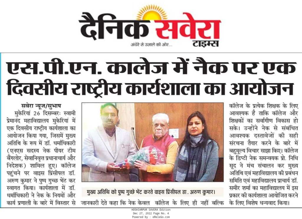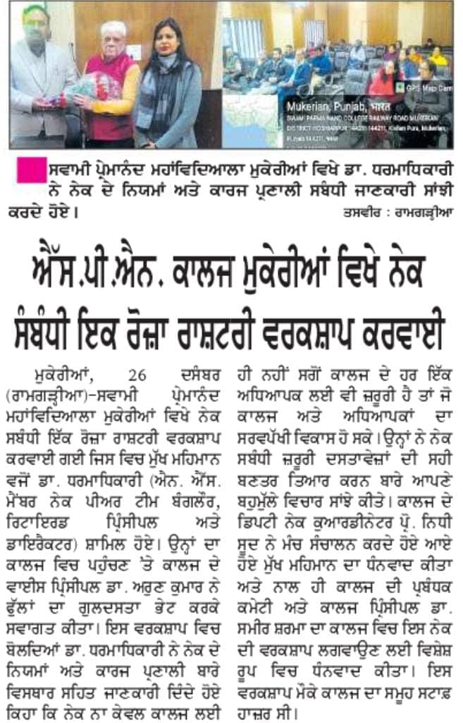 A One-day National Workshop was organised at S.P.N College Mukerian on December 22nd, 22 on NAAC Documentation and Report Preparation. Dr. N.S Dharamadhikari (Member NAAC Peer Team; Retired Principal and Director ) was the resource person of the event. At the outset, Vice Principal and NAAC Coordinator Dr. Arun Kumar welcomed the speaker and highlighted the objective of conducting the workshop and gave the program details. Prof. Dharmadhikari, in his enlightening and edifying address, emphasised the important quality initiatives that can be undertaken by the college for improving its grade in the NAAC accreditation. He also stressed on the proper framing of the reports that are to be submitted for the NAAC process.