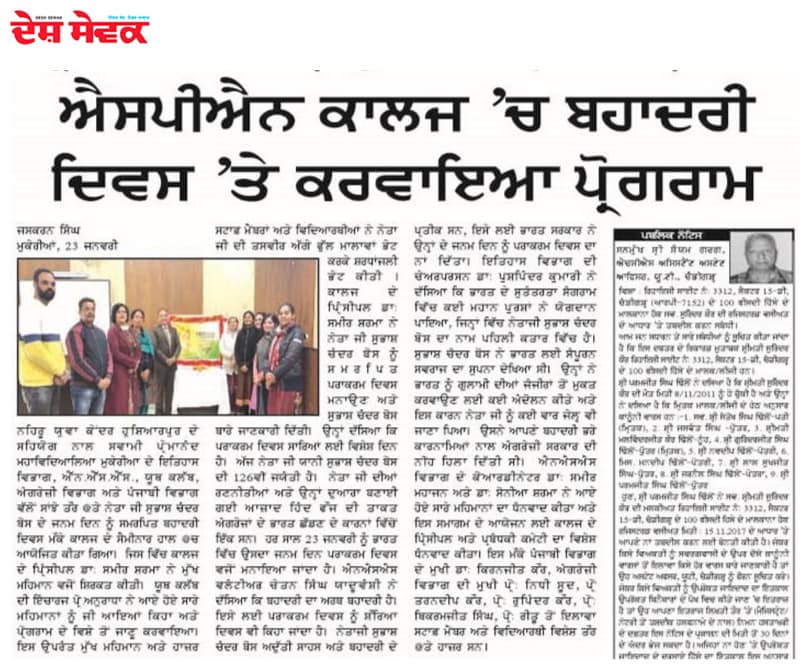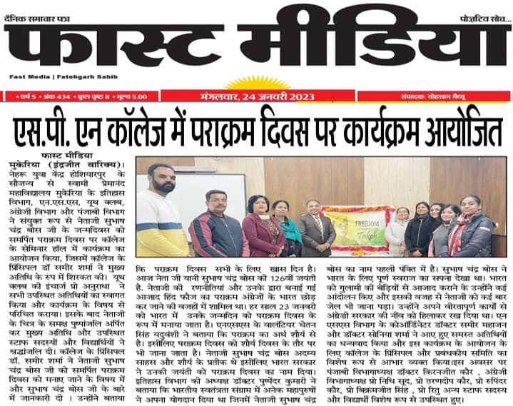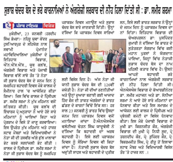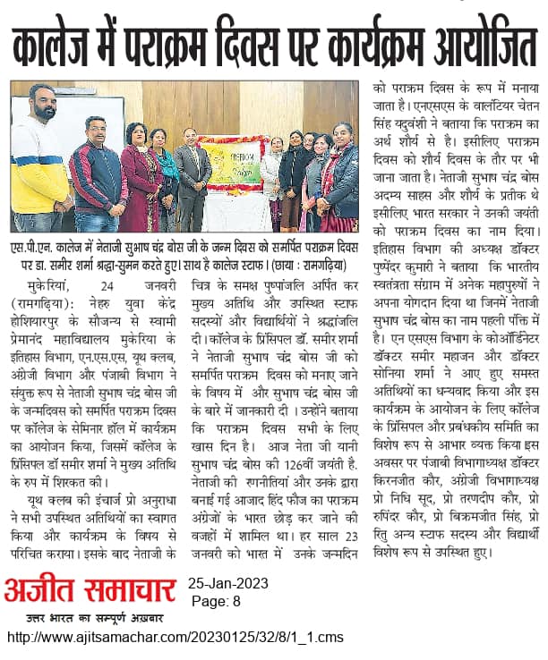 Under the stewardship of Principal Dr. Sameer Sharma, the Post Graduate Departments of History, English, Punjabi and NSS in collaboration with Nehru Yuva Kendra, Hoshiarpur commemorated the birth anniversary of NetaJi Subhash Chandra Bose on 23 January 2023 with patriotic exuberance.
