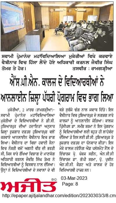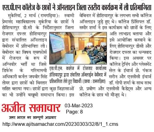 Students of Swami Premanand Mahavidyalaya, Mukerian participated in a webinar titled “Agniveer Recruitment in Indian Air Force” organised by District Employment Office, Hoshiarpur. The webinar was held with an aim to raise awareness among students about Agniveer Air Force recruitment. The guest speaker Colonel Jaiveer Singh Tomer delivered a detailed deliberation on the topic and resolved the queries of students. Principal, Dr. Sameer Sharma thanked the DC Hoshiarpur and the District Employment Office, Hoshiarpur for organising a webinar on such a pertinent topic. Asst. Prof. Pankaj Sareen, Convener of the Training and Placement Cell, Lieutenant Dr. Gopi Sharma (NCC Officer), Asst. Prof. Parveen and NCC Cadets were also present there.