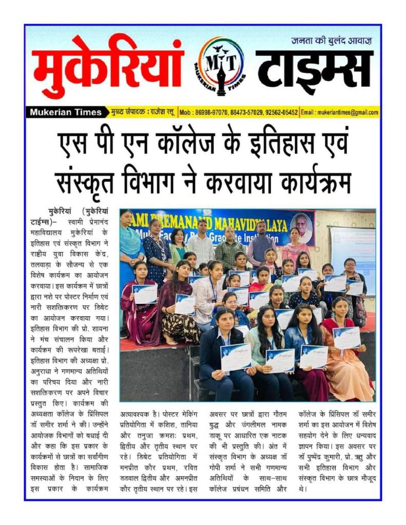 The departments of History and Sanskrit of Swami Premanand Mahavidyalaya, Mukerian in collaboration with National Youth Development Centre, Talwara organised a debate competition on the topic “Women Empowerment”. Asst. Prof. Anuradha, HoD, History commenced the event by welcoming the guests principal Dr. Sameer Sharma, N k Rathore and Ashutosh. On this occasion, a poster making competition on the theme “Drug Addiction” was also organised where Kashish, Taniya and Tanuja attained first three positions, respectively. Manpreet scored first position in the debate, whereas Ravit Dadwal stood second position and Amanpreet secured third position. The event was carried forward with a skit on Lord Buddha and an infamous bandit Unglimaar. The stage was effectively and efficiently moderated by Prof. Shaina. Dr. Gopi Sharma, HoD, Sanskrit offered a vote of thanks to the college principal and the college managing committee. Dr. Pushpinder Kumari, Prof. Ritu and students were also present there.