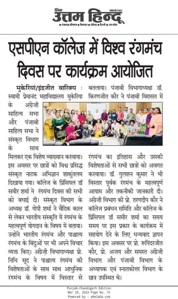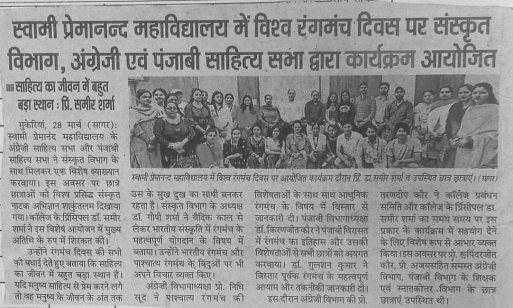 The English Literary Society in collaboration with Punjabi Sahitya Sabha and department of Sanskrit commemorated World Theatre Day on March 27, 2023. Asst. Prof. Nidhi Sood, Head, department of English commenced the event with a warm welcome of the college principal, Dr. Sameer Sharma. Sharing her views on the history of theatre, she stated that for centuries, theatre and drama have been the most popular art form and each age had its own mode of expression and theatrics in place. While addressing the students, principal Dr. Sameer Sharma highlighted the history of the theatre and importance of theatre to enhance and appreciate their role in the field of entertainment and in one’s life.