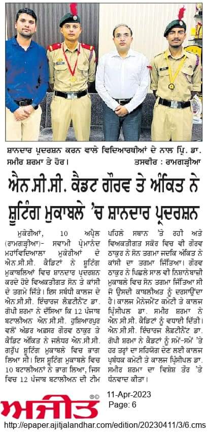Students of Swami Premanand Mahavidyalaya, Mukerian won gold and bronze medals in a shooting competition organized by Jalandhar NCC Group. Apprising about the accomplishment, exceedingly elated Lieutenant Dr. Gopi Sharma, Incharge NCC said Gaurav Thakur and Ankit from 12 Punjab battalion won Gold and Bronze medals, respectively. Ten battalions participated in this shooting competition where 12 Punjab battalion made a mark by attaining first position. He further said Cadet Gaurav has already done exceptionally well by winning a gold medal last year as well.