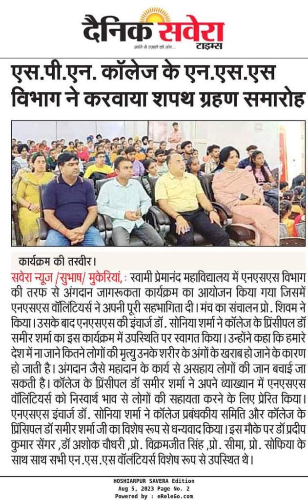 The NSS Department of Swami Premanand Mahavidyalaya, Mukerian, organized an oath-taking ceremony to promote Organ Donation. The event began with a welcome address from NSS In-charge, Dr. Sonia Sharma, who explained the objectives and stressed the importance of organ donation in saving lives during organ transplantation emergencies. Principal Dr. Sameer Sharma commended the NSS department’s efforts and encouraged the youth to foster a supportive community. He emphasized that selfless help is crucial for the welfare and upliftment of society. The event was efficiently moderated by Prof. Shivam, and the NSS volunteers actively participated. They shared their thoughts and took an oath to inspire others to donate organs and save lives. Dr. Sonia Sharma expressed gratitude to the College Management Committee and Principal Dr. Sameer Sharma. Notably, the event was attended by Dr. Ashok Chaudhary, Prof. Bikramjeet Singh, Prof. Seema, and Prof. Sofia.