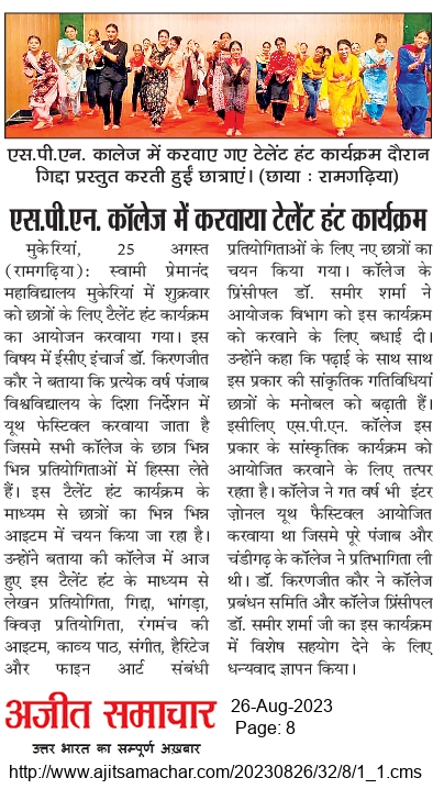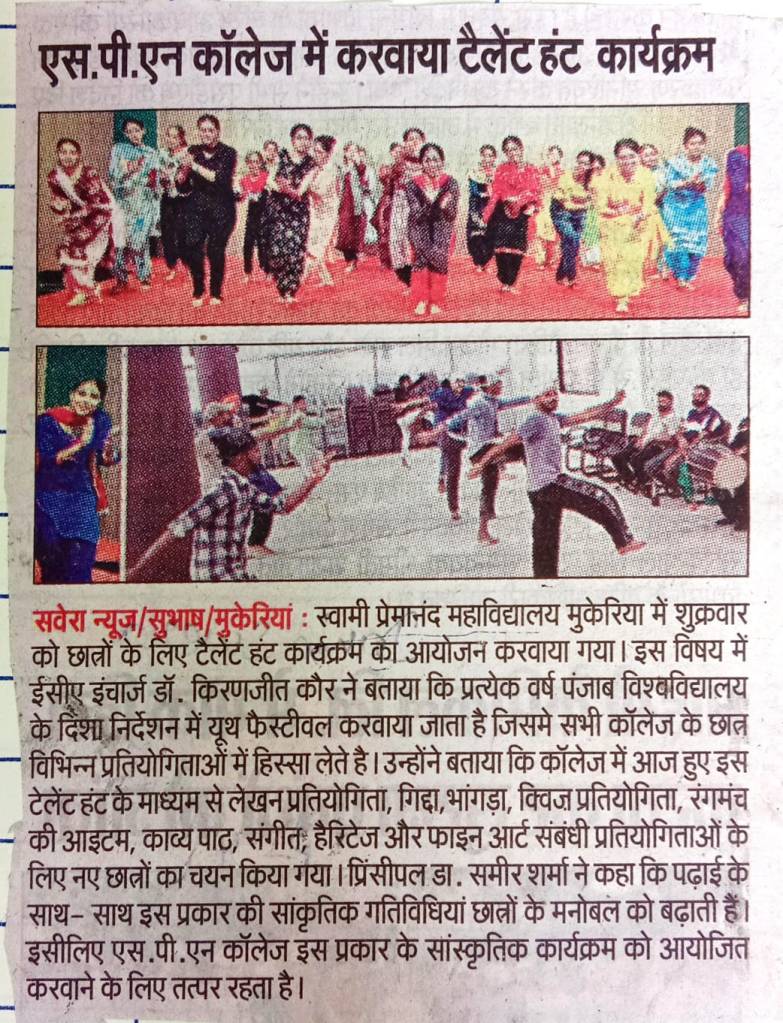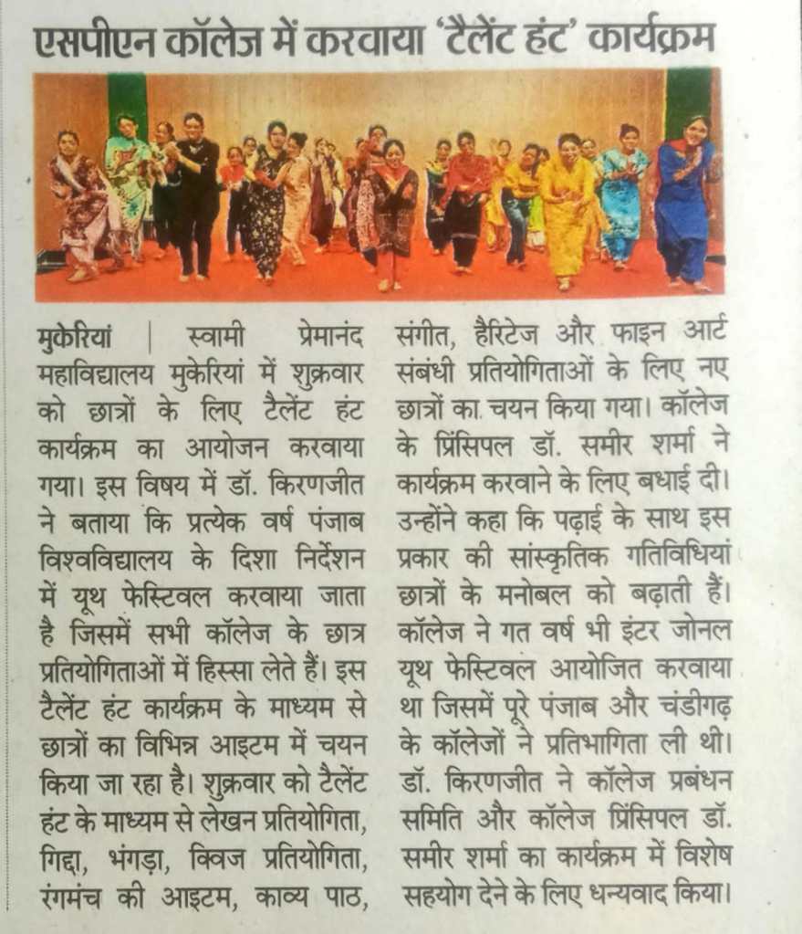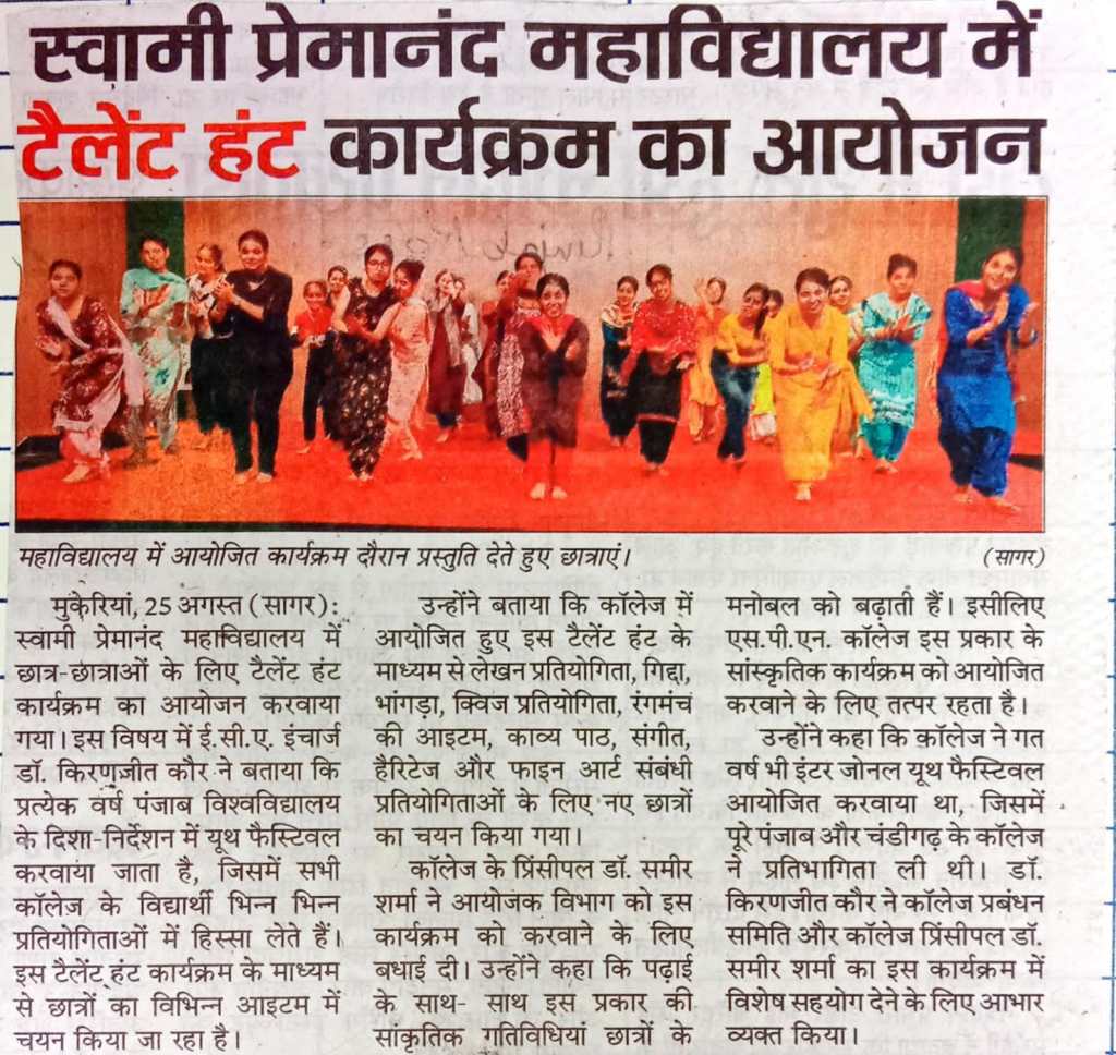 Talent Hunt programme was organized for the students at Swami Premanand Mahavidyalaya, Mukerian. Dr. Kiranjit Kaur, In-Charge ECA mentioned that every year a Youth Festival is conducted under the directions of Punjab University, Chandigarh in which students from all Panjab University affiliated colleges participate in various competitions. Through this Talent Hunt programme, students are selected for competitions like Writing, Giddha, Bhangra, Quiz, Stage items, Poem Recitation, Music, Heritage, and Fine art-related events. College Principal Dr. Sameer Sharma congratulated the all the members of EMA department for conducting this program and stated that cultural activities like these boost the morale of the students alongside their studies and college is remains committed to organizing such cultural programs. The college also organized an Inter-Zonal Youth Festival for the session 2022-23, in which colleges from all over Punjab and Chandigarh participated. All committee members of EMA Department expressed their gratitude for the special support to the College Management Committee and Principal Dr. Sameer Sharma in this program.