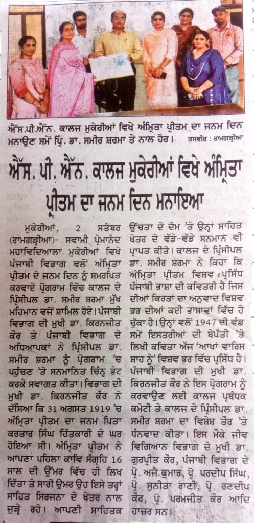 Post graduate Department of Punjabi at Swami Premanand Mahavidyalaya, Mukerian organized an event to commemorate the birth anniversary of the Legend Amrita Pritam. Principal, Dr. Sameer Sharma invited as the chief guest in the program congratulated the students and the staff on this occasion.He further illustrated the that Amrita Pritam is a globally renowned Punjabi poet, and her works have been translated into many languages worldwide. She is honored as the first established Punjabi literary figure and the first modern Punjabi female writer to address women’s concerns. Furthermore Dr. Kiranjit Kaur, Head, Post graduate Department of Punjabi gave a brief biograaphy of the legend and paid a tribute to this literary personality.She also mentioned that Amrita Pritam was honoured with various awards including the Sahitya Akademi Award, Jnanpith Award, Bharat Ratna, and Bharat Vibhushan. Dr. Kiranjit Kaur, expressed gratitude to the College Managing Committee and Principal Dr. Sameer Sharma for their support in conduct of such events. The students along with the faculty members Dr. Gurpreet Kaur, Prof. Ajay Kumar, Prof. Pradeep Singh, Prof. Sunita Rani, Prof. Randip Kaur, Prof. Paramjeet Kaur celebrated the birth anniversary and remembered the legend Amrita Pritam for her contribution to Punjabi literature.