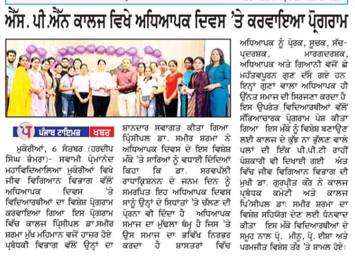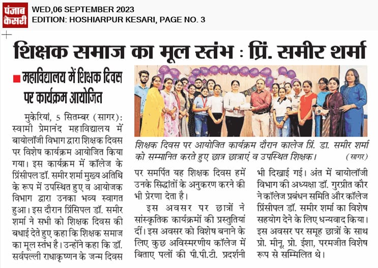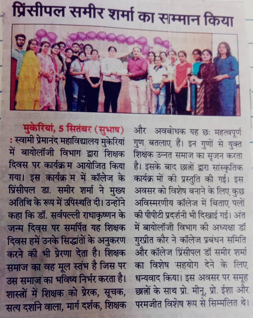 Teacher’s Day was celebrated with great enthusiasm at Swami Premanand Mahavidyalaya by the students of Department of Biology to mark the centennial of the birth of Dr. Sarvepalli Radhakrishnan and to pay a token of respect to their teachers for their contribution. Principal Dr. Sameer Sharma was invited by the students as a special guest to honour and thank him for making all efforts for providing the best faculty and facility in the college and always motivating. Dr. Sameer Sharma praised and congratulated the students for their best efforts in organizing the event and for their respect towards their teachers. The students presented many cultural items and gave compliments to their teachers. Power point presentations to show the achievements and memories of the college were also presented. Dr.Gurpreet Kaur, Head, Department of Biology, thanked the students and gave the students best wishes for their future endeavours.She also thanked the Colllege Managing Committe and Principal Dr. Sameer Sharma for the best wishes and support in the development of the Staff and the students. The event was supported and attended by Prof. Meenu, Prof. Isha and Paramjit .