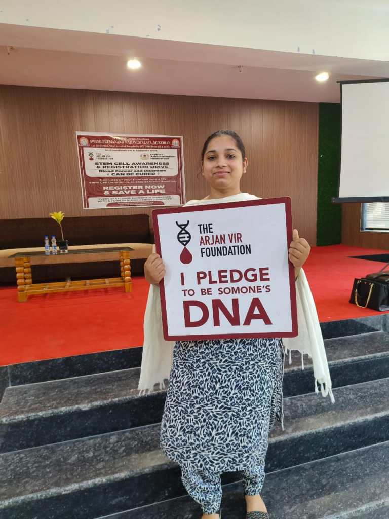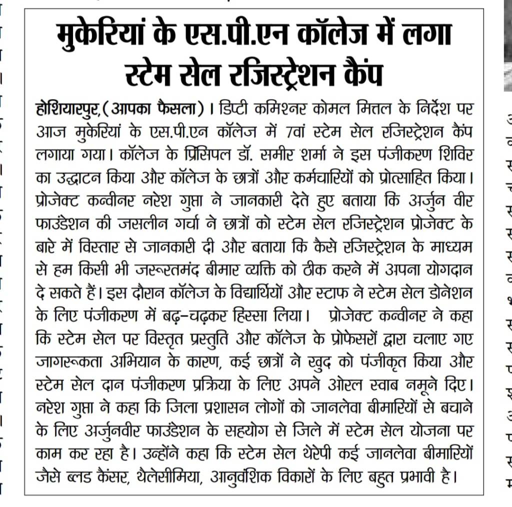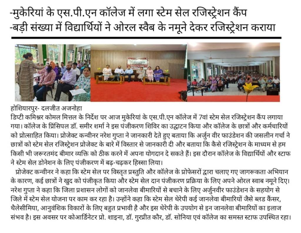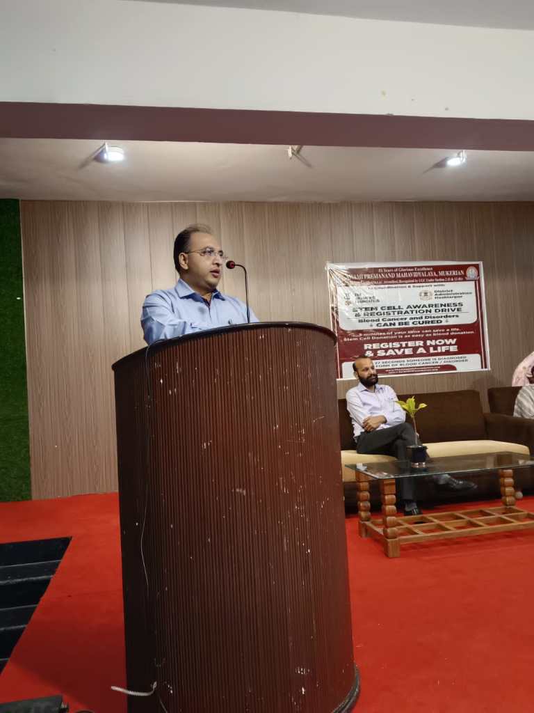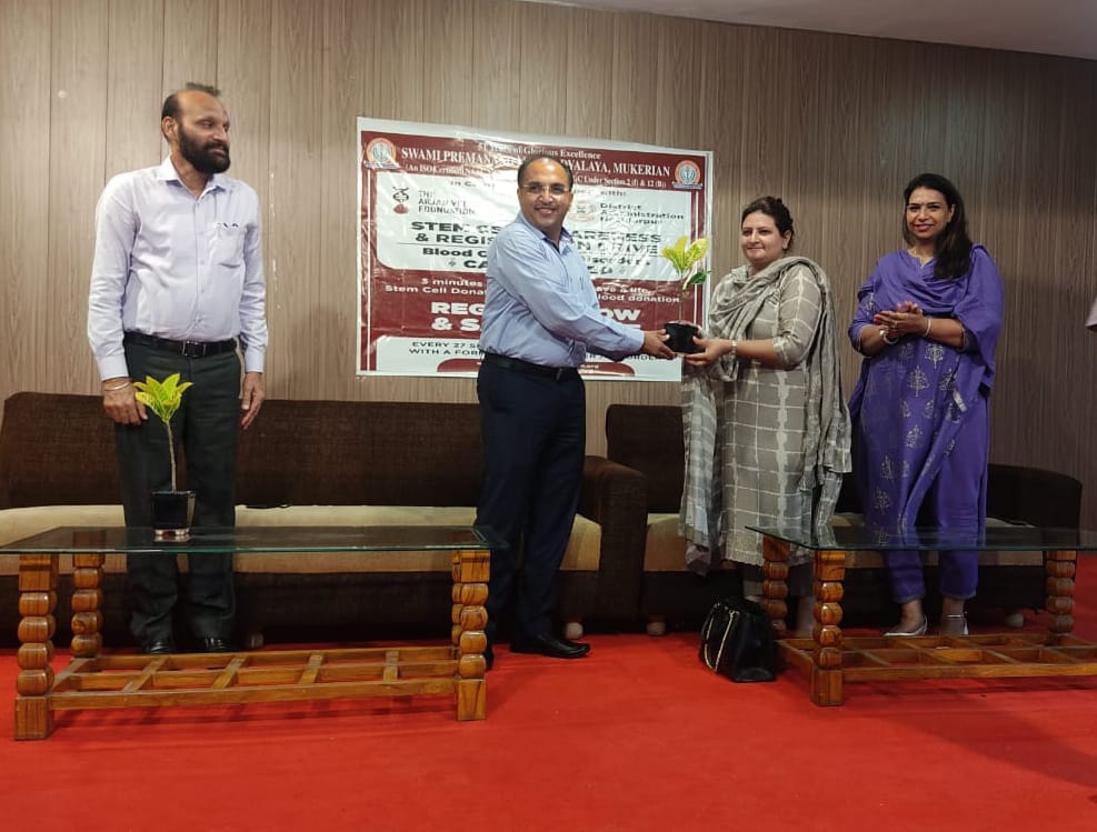 A Stem Cell Awareness and Registration drive was organised by Swami Premanand Mahavidyalaya, Mukerian under the guidance of Principal Dr. Sameer Sharma. The event was conducted in support and collaboration with District Administration, Hoshiarpur and Arjan Vir Foundation. The entire event was moderated by Dr. Gurpreet Kaur, Head, Department of Biology and Prof. Shaina Parmar, Assistant Professor, Post Graduate Department of History. The guests and the hosts of the event comprised of Mr. Naresh Gupta, Convener, Stem Cell Registry Project, District Administration, Hoshiarpur and Ms. Jasleen Garcha from Arjan Vir Foundation. Principal Dr. Sameer Sharma welcomed the guests and encouraged the faculty and the students to participate actively in the noble cause of registering for stem cell donation. Dr. Gurpreet Kaur introduced the the event and motivated all to become a part of this drive.Madam Jasleen Garcha gave a detailed insight into the Stem Cell Therapy. She illustrated the importance and complete protocol of stem cell donation. It’s a matter of pride that 51 cheek cell samples were donated for HLA typing required for stem cell donation at Swami Premanand Mahavidyalaya. The event evidenced that the faculty and the students of SPN College, Mukerian have always worked and have always promoted the welfare of the society. Contribution by a large number participants is worth appreciating.The event was made successful with the joint action and support of the NCC, NSS, Red Ribbon Club and the Youth clubs of the college. The event concluded by a vote of thanks by Prof. Shaina Parmar.