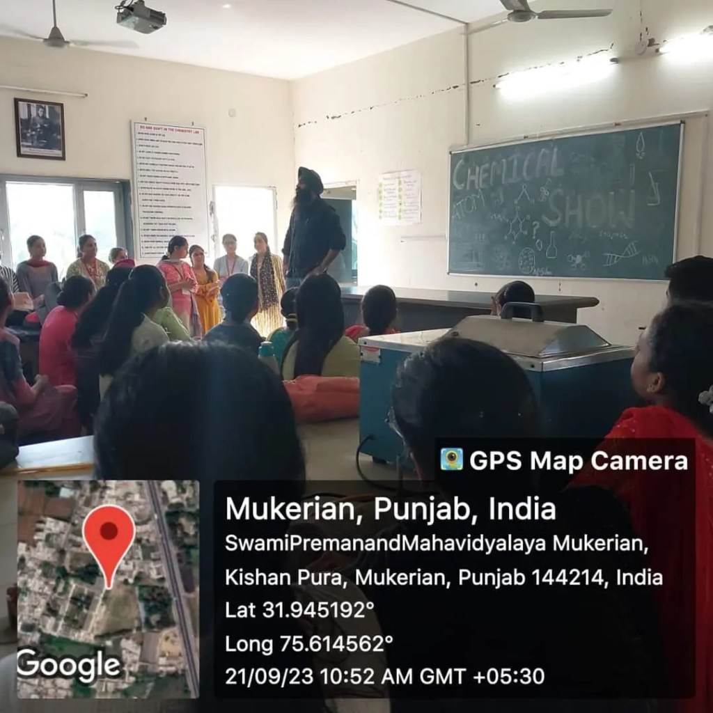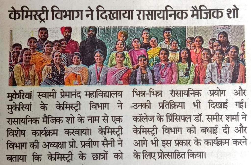 The Post Graduate Department of Chemistry at Swami Premanand Mahavidyalaya, Mukerian organized a magic show with laboratory chemicals under the guidance of Prof. Rekha Rani, President of the Chemical Society. Prof. Praveen Saini, Head Department of Chemistry explained that during this program, chemistry students demonstrated various chemical experiments and their reactions.She also mentioned that the event also comprised of the reactions replicates from current research. Principal Dr. Sameer Sharma, congratulated the Department of Chemistry and encouraged them to continue organizing such programs in future. He also highlighted that there are no miracles for a scientist, and seemingly fantastic phenomenons can be easily explained with understandings of the principles of the chemical reactions. The aim of the event was to inform, inspire and entertain the students with hands on magic show with chemicals highlighting the chemical and scientific principles behind the reactions. The highlights of the events included to develop different colours to demonstrate fluorescence, phosphorescence and also to encounter different smells by different chemical reactions. Every reaction created a curiousity amongst the students that they got anxious for the next surprising reaction. It was a very informative hands on activity to aware and to create interests of the students towards chemistry.. Dr. Jasminder Singh expressed gratitude for the special support provided by the College Management Committee and Principal, Dr. Sameer Sharma.