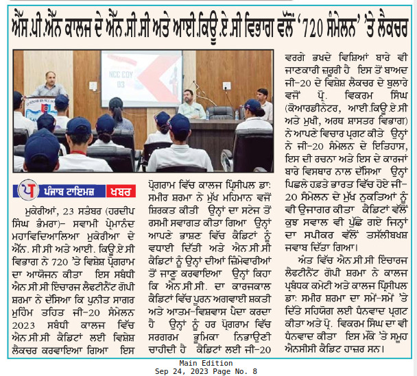 The NCC and the IQAC Departments of Swami Premanand Mahavidyalaya, Mukerian collaboratively organized a lecture on the ‘G20 Summit.’ NCC In-charge Lieutenant Dr. Gopi Sharma mentioned that as part of the Puneet Sagar campaign, a special lecture was organized for NCC cadets on the G20 Summit 2023. Principal, Dr. Sameer Sharma was invited as the chief guest and was warmly welcomed at this awareness programme. In his address, he congratulated the cadets and made them aware of their responsibilities as NCC cadets. He emphasized that NCC’s tenure nurtures leadership skills and self-confidence among cadets, encouraging them to actively participate in every event. He emphasized that knowledge of topics like G20 is very much required for the cadets. Following this, as the guest speaker for the G20 lecture, Prof. Vikram Singh (Coordinator, IQAC and Head of the Economics Department) shared his insights. He provided detailed information about the history, genesis, and workings of the G20 Summit. He also shed light on the main points of G20 Summit held in India recently. The querries of the NCC Cadets were satisfactorily answered by Prof. Vikram Singh. In the end, NCC In-charge Lieutenant Dr. Gopi Sharma expressed gratitude for the support provided by the College Management Committee and College Principal Dr. Sameer Sharma from time to time. He also extended thanks to Prof. Vikram Singh.