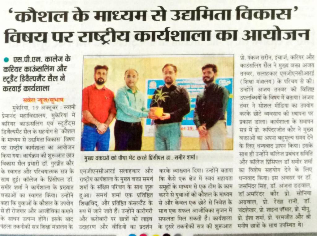 The SPN College Managing Committee and Principal Dr. Sameer Sharma appreciated the organizing of such workshop by the Career Counselling and Students Development Cell of the college and also thanked Mr. Samarath Sharma and Mr. Ajay Tanwar whose guidance generated a ray of hope among the youngsters that awareness and skill in combination can help them in generating employments for them themselves. The workshop was supervised by Dr. Jasminder Singh, Dr. Amrinder Kaur,Dr.Anjana Dadhwal, Prof. Sonia Agarwal, Prof. Rekha Rani,Dr.Chandra Shekhar, Prof. Shaina Parmar, Prof. Parveen. The event was conducted with the help and support of Prof. Meenu, Prof. Isha Sharma, Paramjit and Mr. Manish.