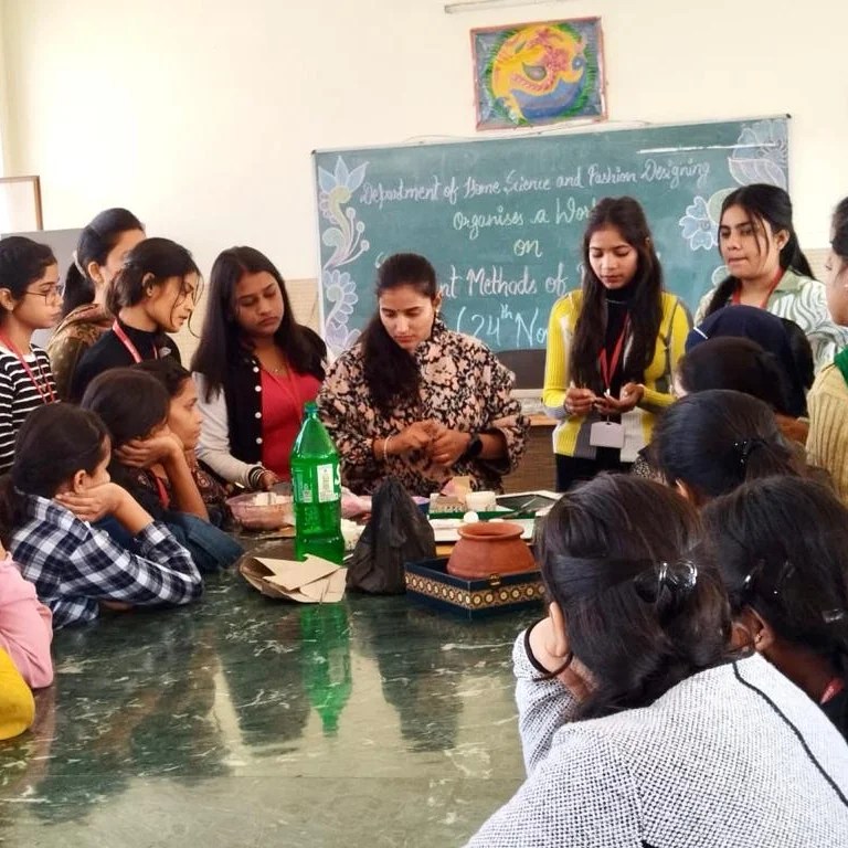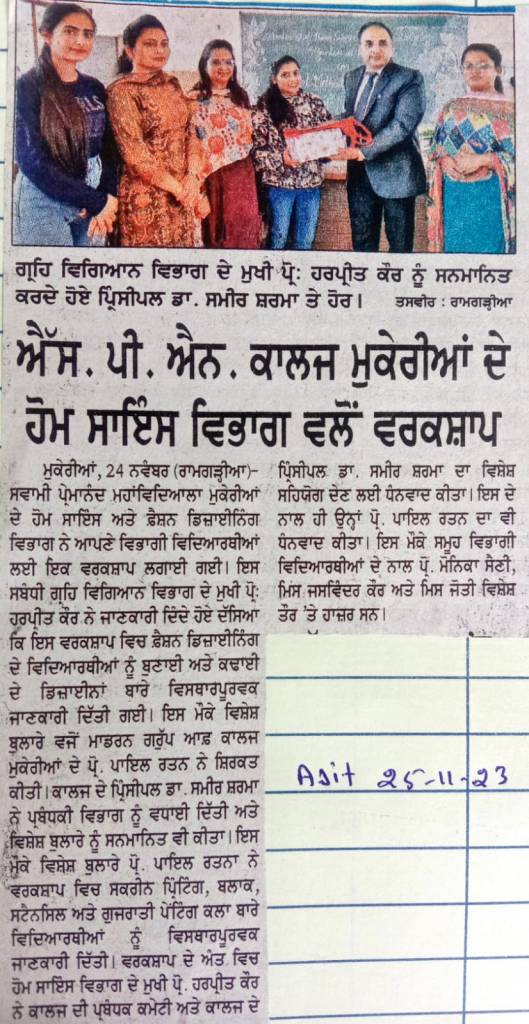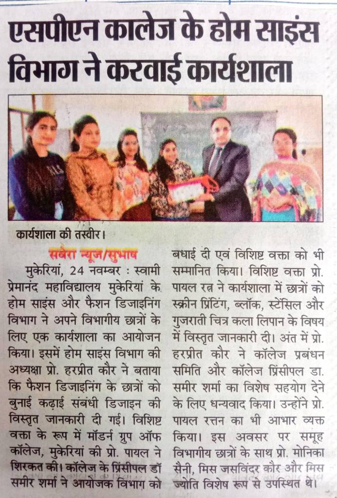 The Home Science and the Fashion Designing Department of Swami Premanand Mahavidyalaya, Mukerian, organized a workshop on Sewing and Embroidery for their departmental students. During this workshop, Mrs Harpreet Kaur, the Head, Department of Home Science, explained detailed information about designs related to sewing and embroidery for Fashion Designing students. Mrs Payal from Modern Group of Colleges, Mukerian, participated as a special speaker. College Principal Dr. Sameer Sharma congratulated the organizing department and honored the special speaker. Mrs Payal Ratan provided detailed information on screen printing, block, stencil, and Gujarati painting during the workshop. In the end, Mrs Harpreet Kaur expressed gratitude for the special support of the College Management Committee and College Principal Dr. Sameer Sharma. She also thanked Mrs Payal Ratan on this occasion. Mrs Monica Saini, Miss Jaswinder Kaur, and Miss Jyoti were also present at this event with the students.