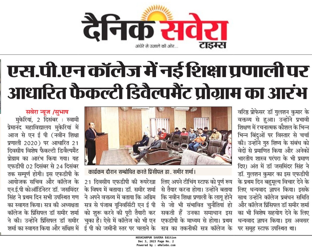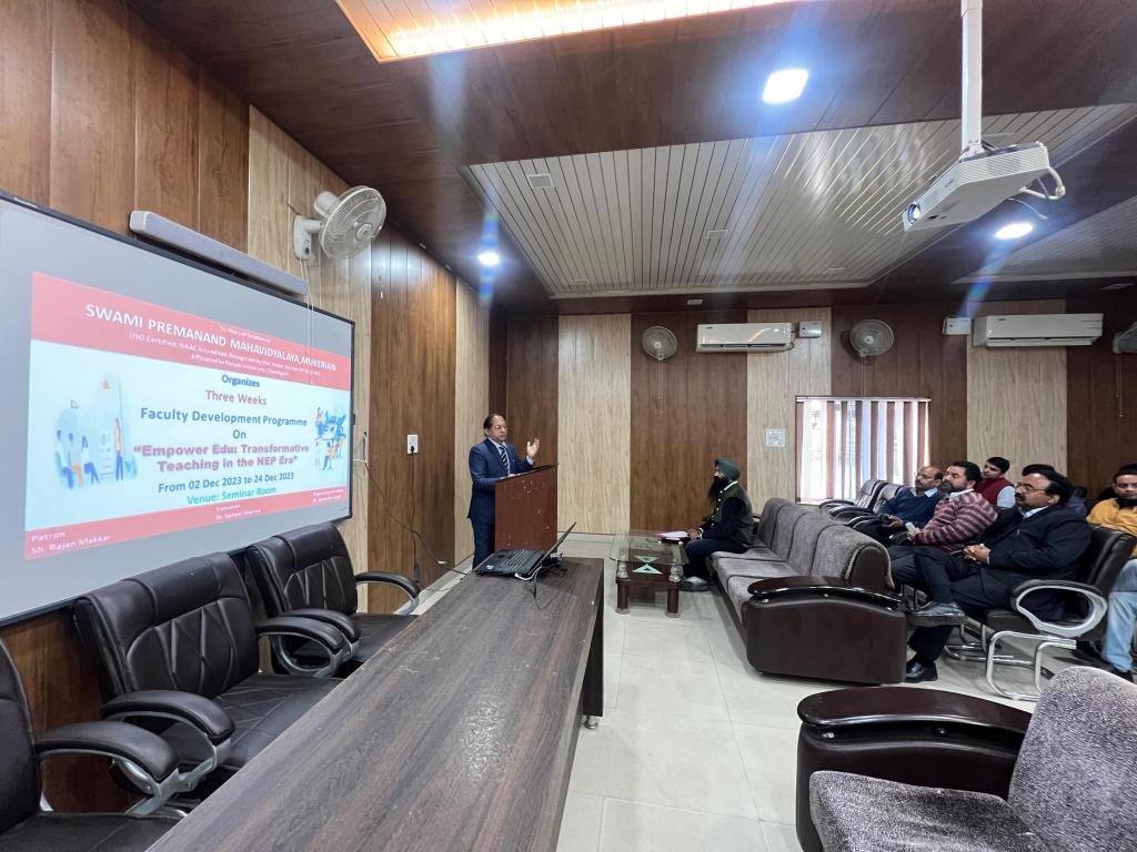 Swami Premanand Mahavidyalaya, Mukerian organized a 21-day Faculty Development Program( FDP) on ‘Empower Edu: Transformative Teaching in NEP Era’. The FDP commenced on 2nd December 2023 and will conclude on 24th December 2023. On the first day of the FDP, Principal Dr. Sameer Sharma welcomed the participants and outlined the agenda of the 21-day FDP. He also emphasized the college’s preparedness to implement New Education Policy ( NEP) and highlighted the challenges that could be addressed through this programme. Dr. Jasminder Singh, NEP Coordinator of the college and the Organizing Secretary of the FDP gave an overview of the lectures/talks and discussion sessions to be covered in the 21-day FDP. He further started the first technical session by introducing the speaker of the technical session of the first day of the FDP, Dr. Gulshan Kumar, the Senior Professor of the college who retired as Head, Postgraduate Department of English of the college. Dr. Gulshan Kumar gave valuable insights on creative skills in effective teaching. He discussed the methods and techniques which can make teaching learning process more effective and efficient. The technical session concluded by vote of thanks by Dr. Jasminder Singh. He expressed gratitude to Dr. Gulshan Kumar for his very elaborative and explanatory session on the inaugural day of FDP. He also extended thanks to SPN College Managing Committee and Principal Dr. Sameer Sharma for their support in organizing the FDP.