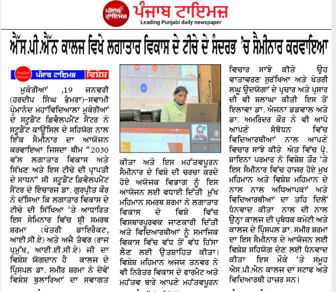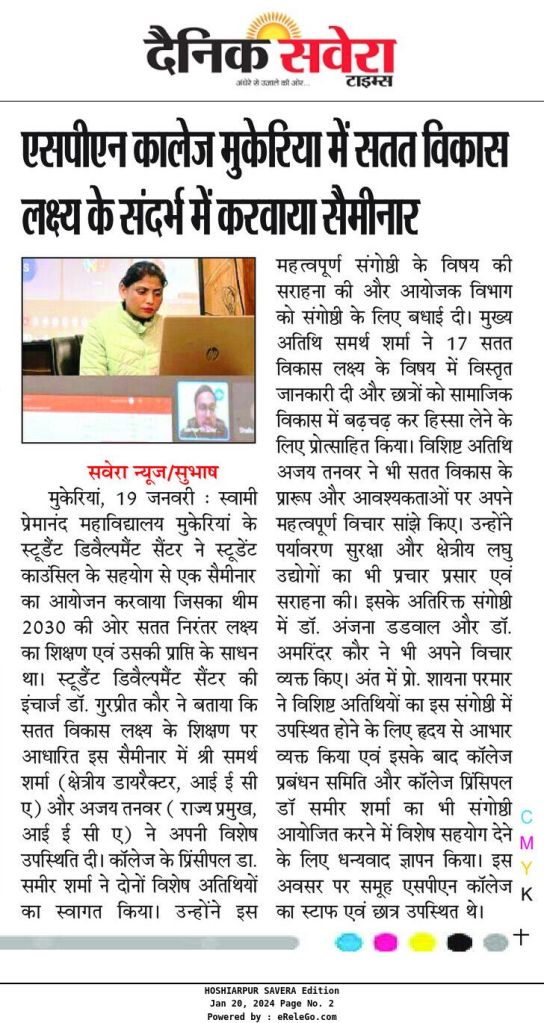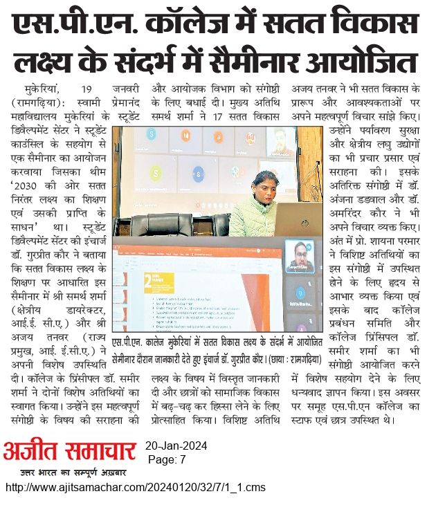 The Student Development Center in collaboration with Student Council at Swami Premanand Mahavidyalaya, Mukerian organized one day National Seminar on ‘Towards 2030:Teaching the SDGs National Seminar for Learners’ in support with the Institute for Environment Conservation Advocacy, Hyderabad. The seminar started with the welcome adress by Dr. Gurpreet Kaur, Incharge Student Development Centre. Principal Dr. Sameer Sharma welcomed Mr. Samarath Sharma, Regional Director, IECA and Mr. Ajay Tanwar, State Head, IECA. Principal Dr. Sameer Sharma encouraged such seminars and praised the organizing committee for their efforts.