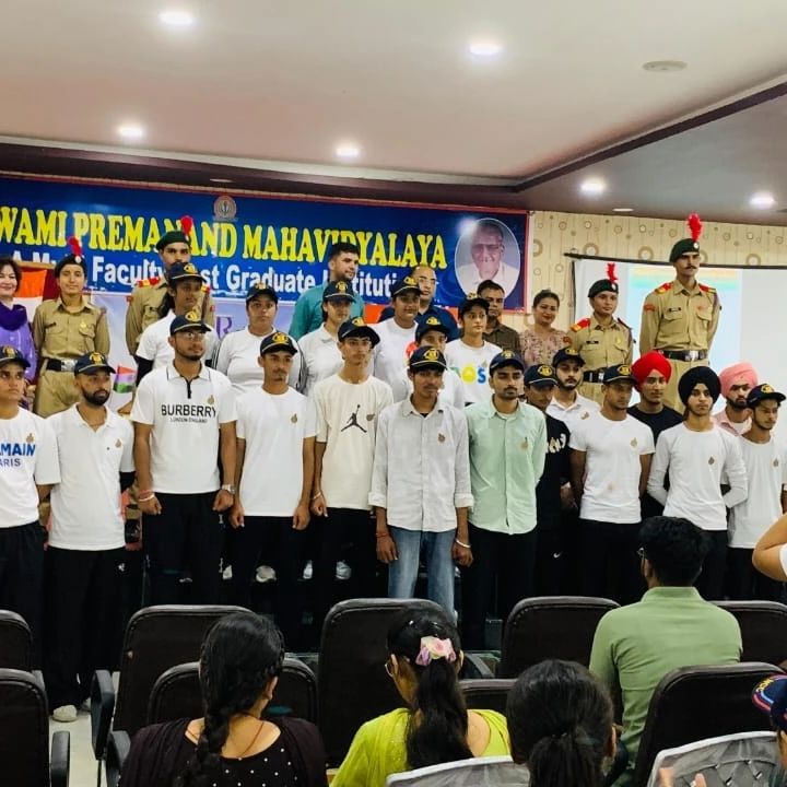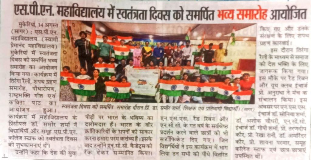 A grand event dedicated to Independence Day was also organized at Swami Premanand Mahavidyalaya, Mukerian. The program included a Tiranga rally, an oath-taking ceremony, tree plantation, patriotic songs, and poetry recitations. Principal Dr. Sameer Sharma, extended heartfelt Independence Day greetings to the students and the SPN College staff. In his address, he emphasized that the future of India rests on the shoulders of the youth. He stressed that it is our utmost duty to fulfill the dreams of India’s brave freedom fighters. Following this, he honored the NCC cadets by awarding them ranks.