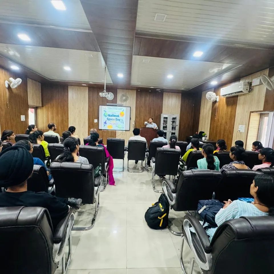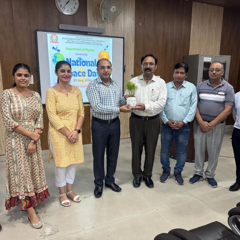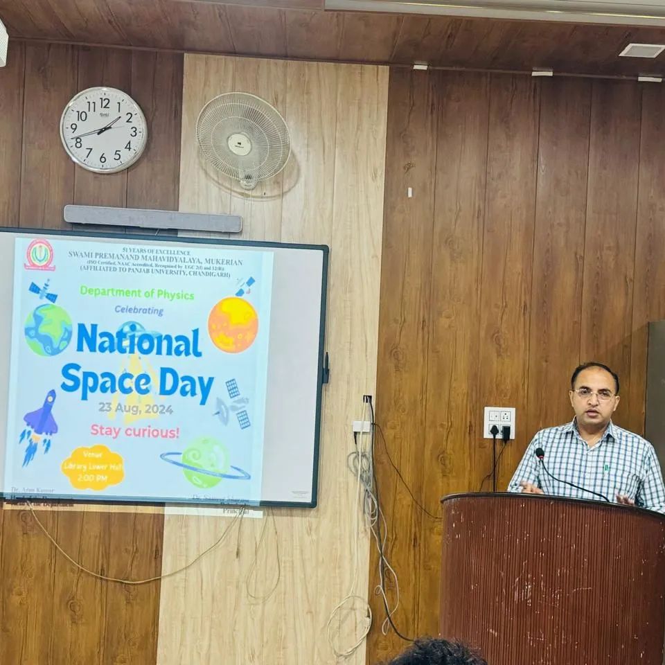 Swami Premanand Mahavidyalaya, Mukerian, celebrated National Space Day organized by the Postgraduate Department of Physics. The event aimed to raise awareness among students about advancements in space exploration and technology. Dr. Arun Kumar, Head, Postgraduate Department of Physics, welcomed Principal Dr. Sameer Sharma and outlined the program.