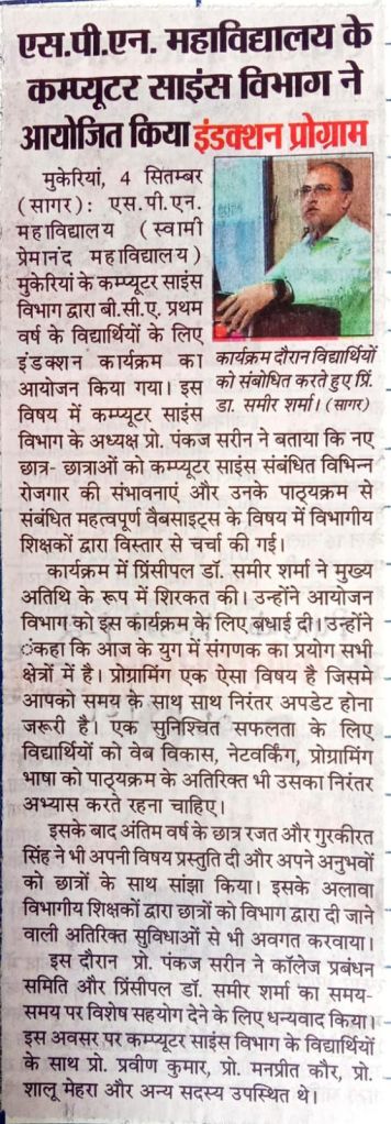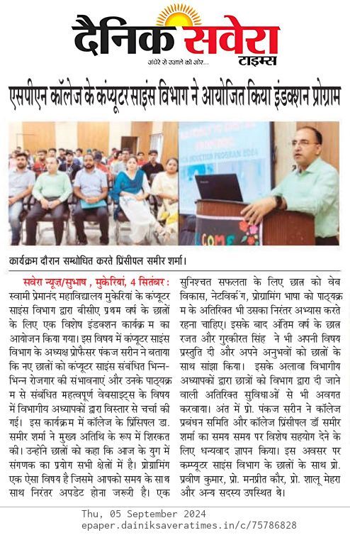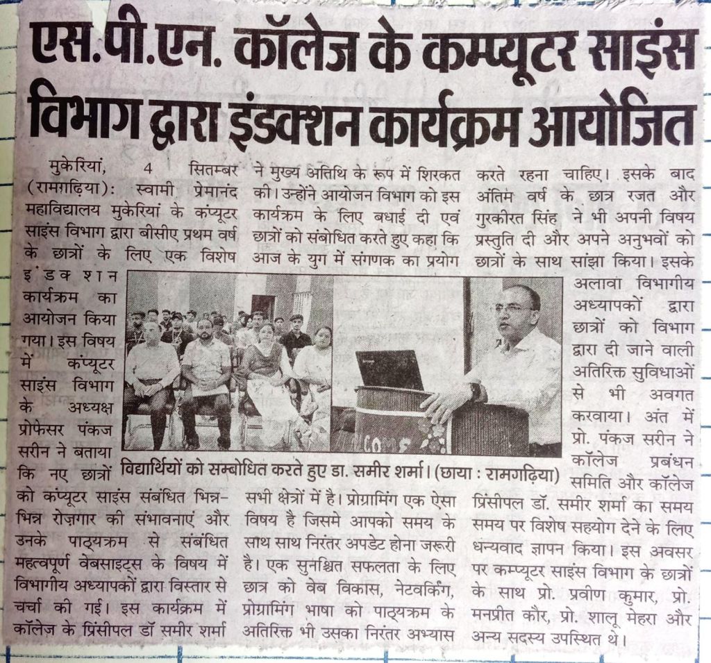 The Post Graduate Department of Computer Science at Swami Premanand Mahavidyalaya, Mukerian, organized an induction program for first-year BCA students. In this regard, the Prof. Pankaj Sareen, Head, Post Graduate Department of Computer Science, stated that the departmental teachers discussed various employment opportunities related to computer science and important websites related to the students’ curriculum in detail.