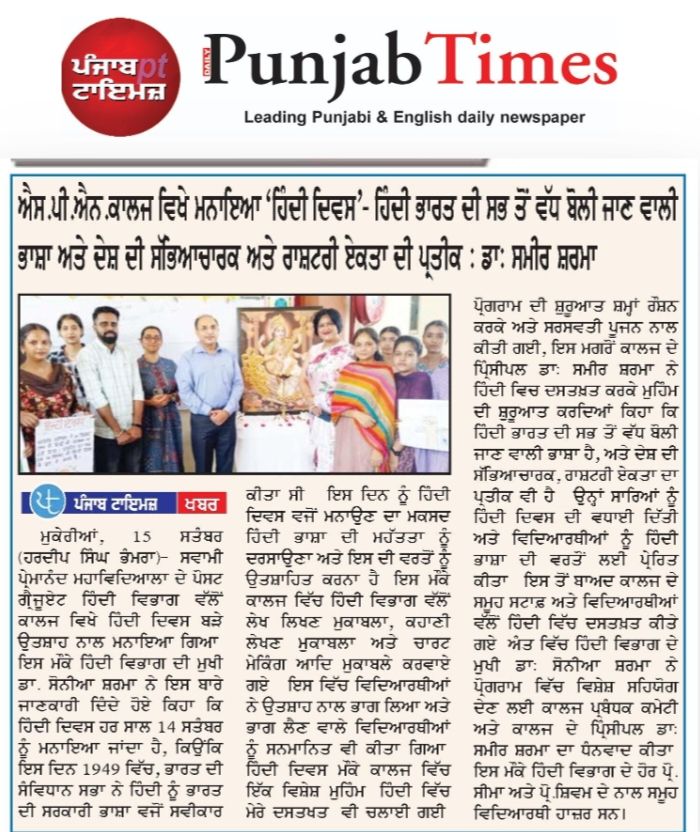 Mahavidyalaya, Mukerian under the guidance of Principal Dr. Sameer Sharma. On this occasion, Dr. Sonia Sharma, Head, Post Graduate Department of Hindi shared that Hindi Diwas is celebrated every year on September 14, as on this day in 1949, the Constituent Assembly of India adopted Hindi as the official language of the country. The purpose of celebrating this day is to promote the importance of the Hindi language and encourage its use. Hindi is the most widely spoken language in India and is a symbol of the country’s cultural and national unity.
