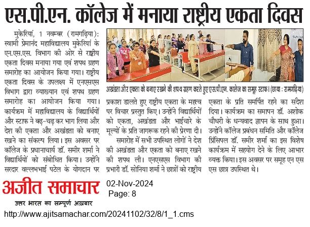 Dr. Sonia Sharma, In-Charge NSS (Girls) urged students to stay dedicated to the cause of national unity. The program concluded with a vote of thanks from Dr. Ashok Chaudhary, In-charge, NSS (Boys) who expressed gratitude to SPN College Management Committee and Principal Dr. Sameer Sharma, for their support in making the event a success. NSS student volunteers were present for this occasion.