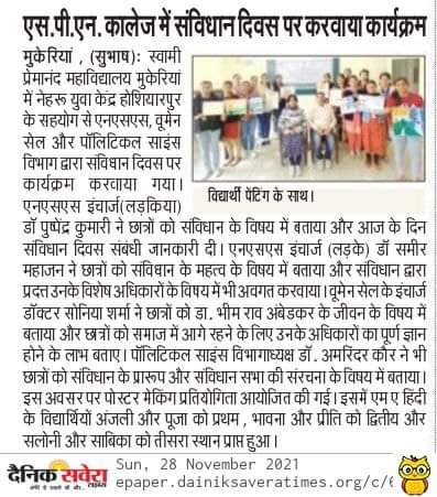 The department of Political Science, NSS and Women Cell of Swami Premanand Mahavidyalaya, Mukerian organized an event on the occasion of “Constitution Day” on November 26 to commemorate the adoption of the constitution of India. Dr. Pushpinder Kumari, In charge NSS ( Girls Wing) highlighted the significance of […]