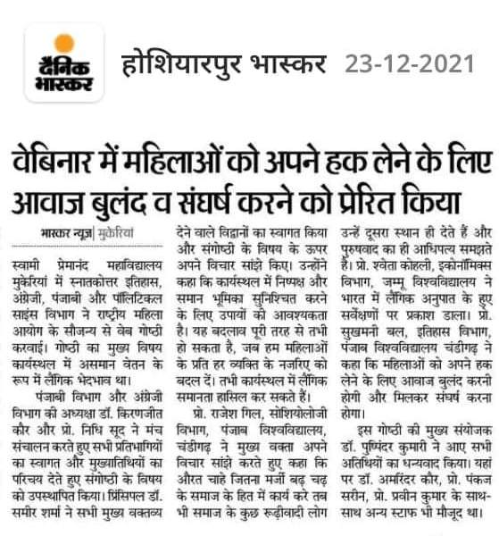 The post- graduate departments of History, English, Punjabi and Political Science, Swami Premanand Mahavidyalaya Mukerian organised a National Commission for Women(NCW), India sponsored national webinar on the topic “Unequal Pay: Gender Discrimination at Workplace” on December 21, 2021. The major concerns of the webinar were Gender Discrimination: Unequal […]